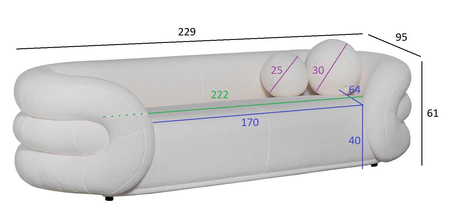 description-full - Уютный белый диван футуристической формы выполнен из мягкой обивки, по фактуре напоминающей овечью шкуру. Оригинальные мягкие выпуклые объемы внешней части и шаровидные декоративные подушки несомненно будут притягивать взор и позволят в полной мере воспользоваться преимуществами этого дивана как дизайнерского объекта. В комплект входят две шарообразные подушки диаметром 25 и 30см. Габариты сиденья: ширина 170(222)см, глубина 64см, высота от пола 40см, высота спинки 21см. Сочетается с креслом DY-KRES-117 BEL.