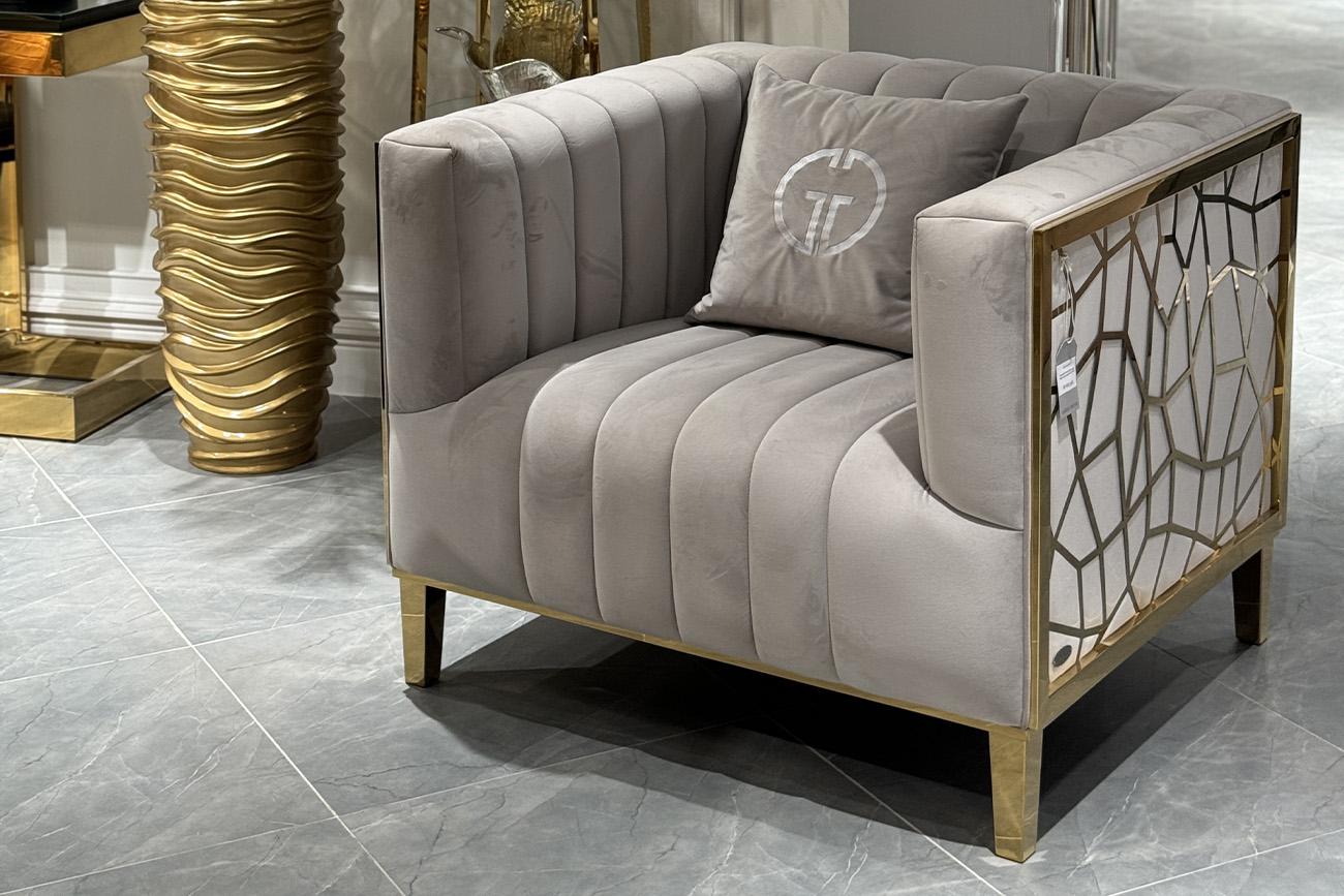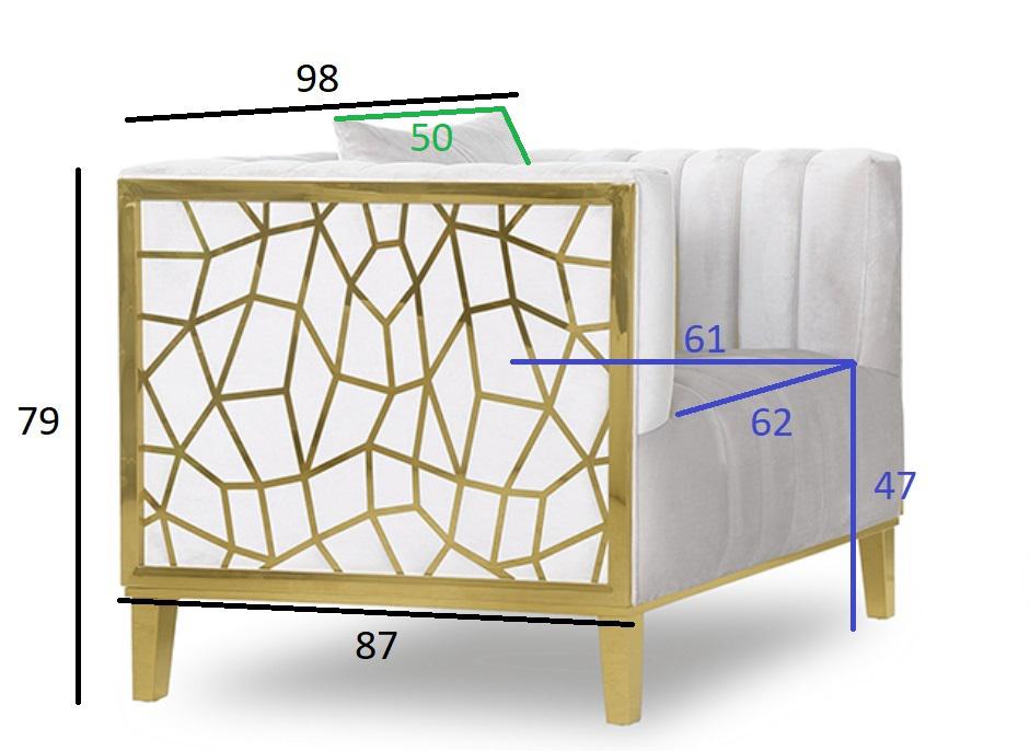 description-full - Роскошное прямоугольное креслоиз серии Базель (Basel), в котором воплотились лучшие черты стиля ар-деко. Без ложной скромности и пафоса. Элегантное и максимально комфортное. Невысокая спинка, которая составляет единое целое с подлокотниками, обеспечивает удобную посадку и поддержку спине. Это эксклюзивное кресло имеет свою изюминку – оригинальный каркас из нержавеющей стали золотистого цвета. Декоративная подушка с вышивкой является красивым дополнением, которое делает дизайнерское кресло в интерьере чуть ли не главным украшением. Предлагаем купить данную модель в сочетании с диваном из этой же коллекции. Габариты сиденья: ширина 62см, глубина 61см, высота от пола 47см. В комплект входит 1 декоративная подушка 50*50см с логотипом GD (GARDA DECOR). Сочетается с двухместными диванами 102AN-DIV-8682-SER.
