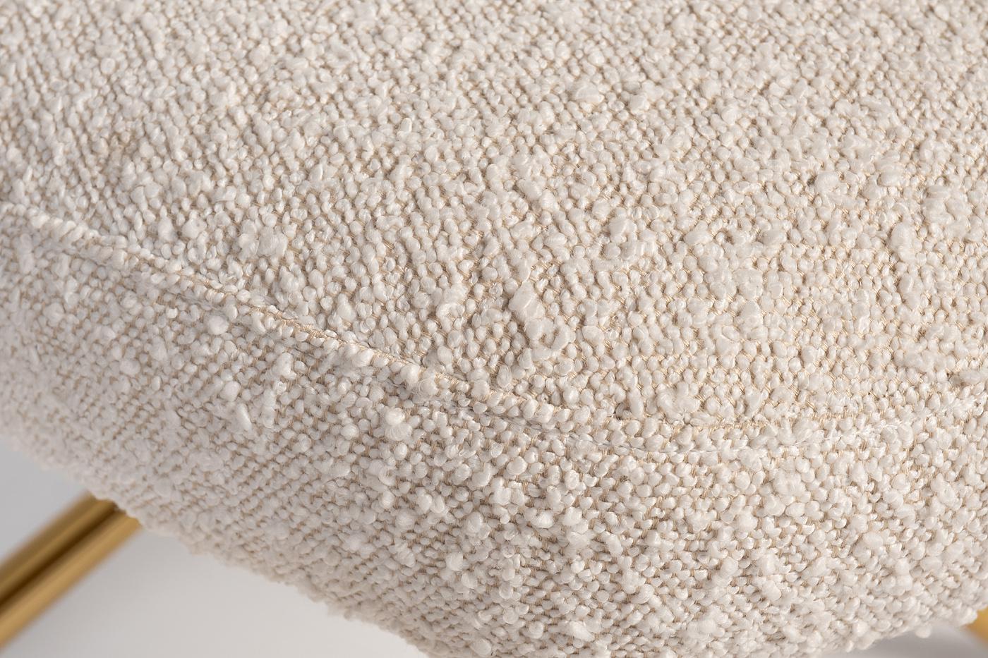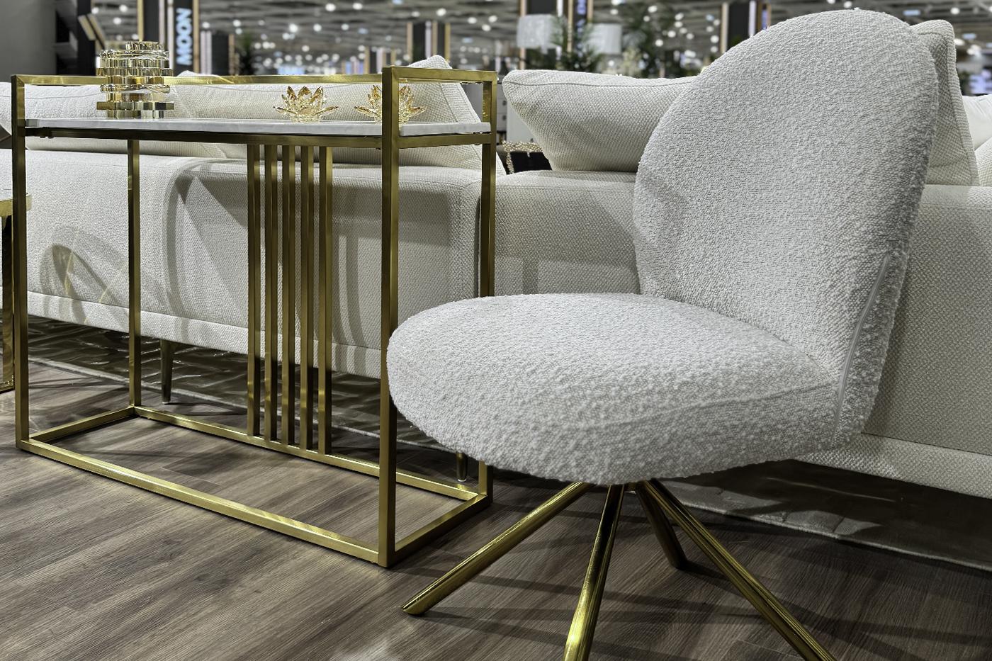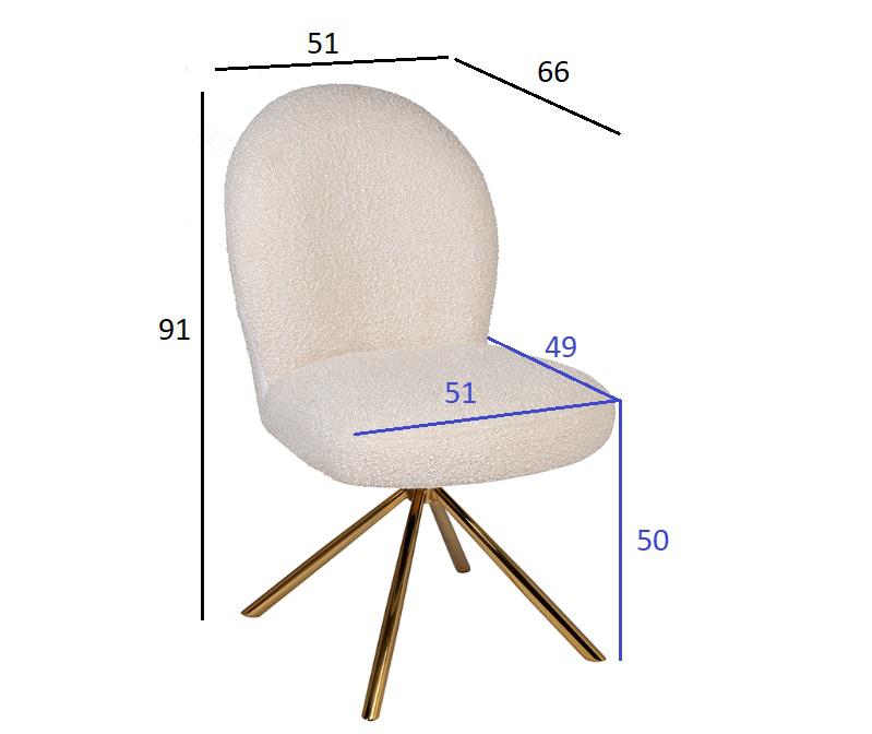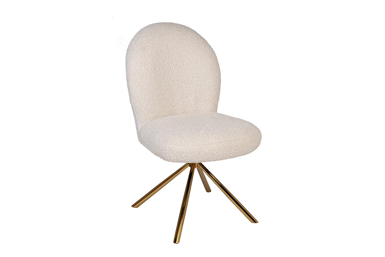 description-full - Оригинальный обеденный стул с вращающимся сиденьем и стильной обивкой из белоснежного букле. Современный дизайн встречается с классическим комфортом в этом стуле. Сочетание обтекаемых линий, мягкой обивки и блестящего каркаса придает ему особый шарм. Мягкая обивка из белоснежного букле создает ощущение невесомости и уюта, словно вы парите в облаке. Элегантный золотистый каркас придает стулу изысканность и роскошный вид, а вращающийся механизм добавляет функциональности. Этот стул станет идеальным дополнением для любой современной гостиной или стильной кухни. Обеденный стул с обивкой из белой ткани букле. Основание – сталь цвета брашированное золото с поворотно-возвратным механизмом. После поворота пружина плавно возвращает сиденье со спинкой в исходное положение. Габариты сиденья: ширина 51см, глубина 49см, высота от пола 50см.