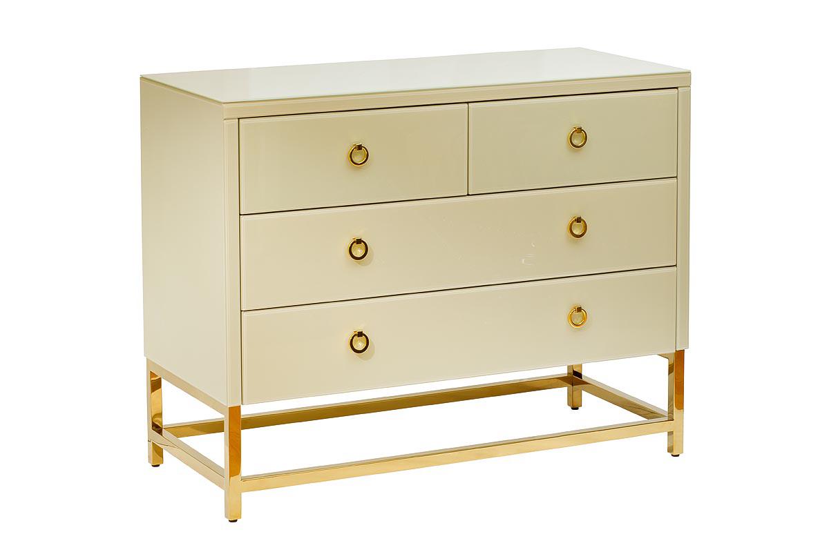 description-full - Вместительный глянцевый комод станет украшением современного интерьера в скандинавском стиле. Лаконичность изделия смягчают ручки и фигурная опора, выполненные из золотистого металла. Комод оснащен 2 полноразмерными и 2 половинными ящиками с надежной фурнитурой, обеспечивающей комфортную эксплуатацию и долговечность. Тонированное бежевое стекло, из которого выполнены столешница и фасад, придают комоду легкий и компактный вид. Он прекрасно впишется в спальню или гостиную, поможет создать оригинальный и функциональный интерьер. Комод гармонично дополнит тумбочка арт. KFC763E7 из этой же коллекции.