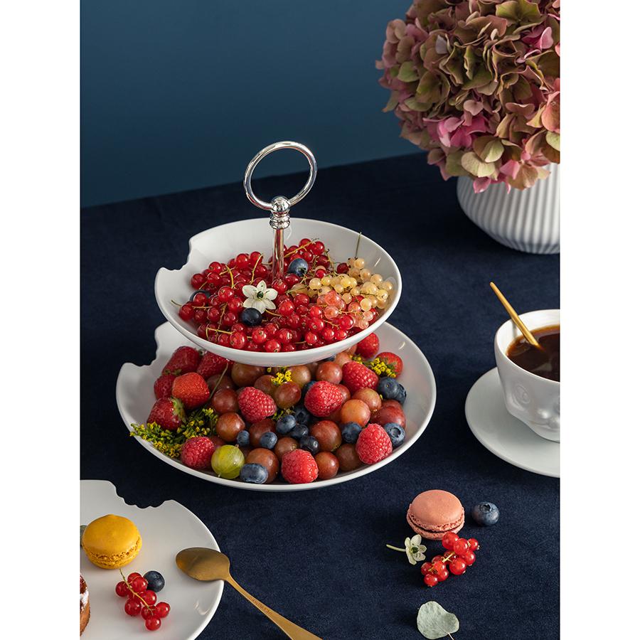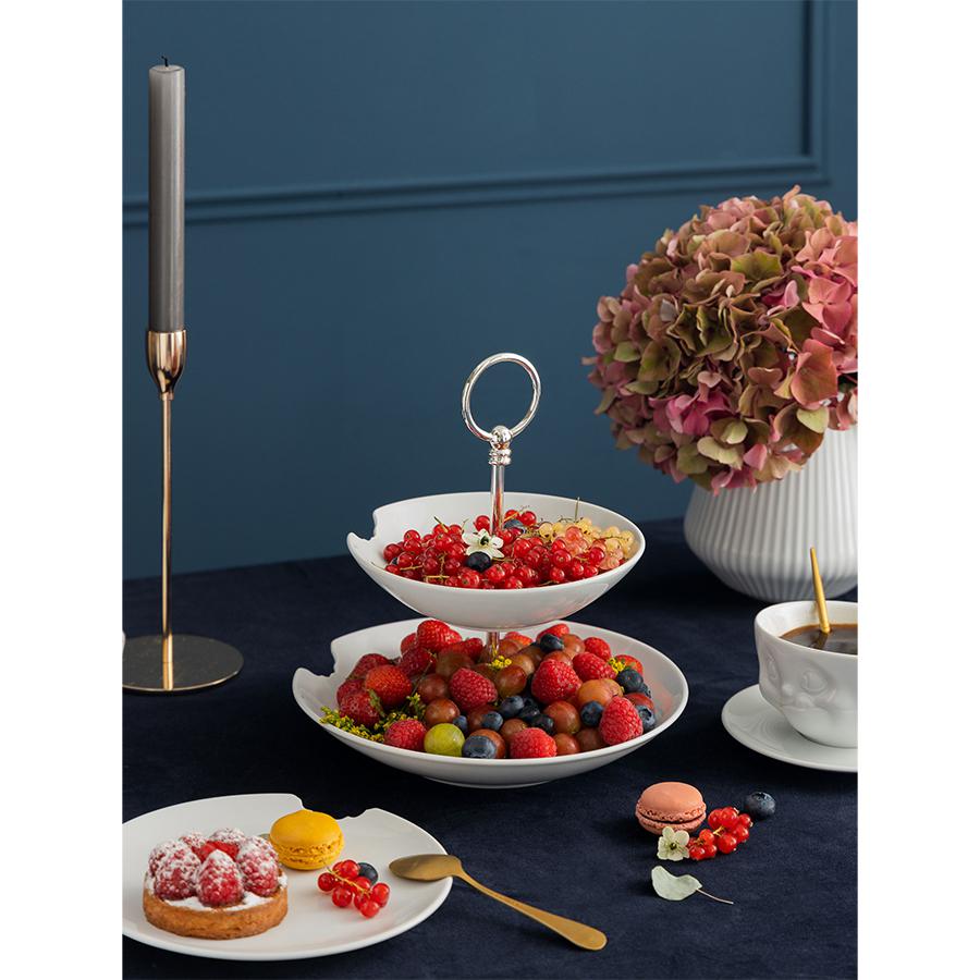 Этажерка в элегантном дизайне прекрасно подойдет для эффектной подачи фруктов и сладостей. Ярусы выполнены из высококачественного фарфора. Диаметр нижней тарелки — 24 см, верхней — 18 см. Этажерка поставляется в разобранном виде. Упакована в подарочную коробку.