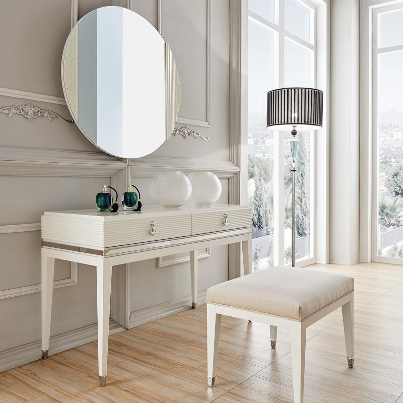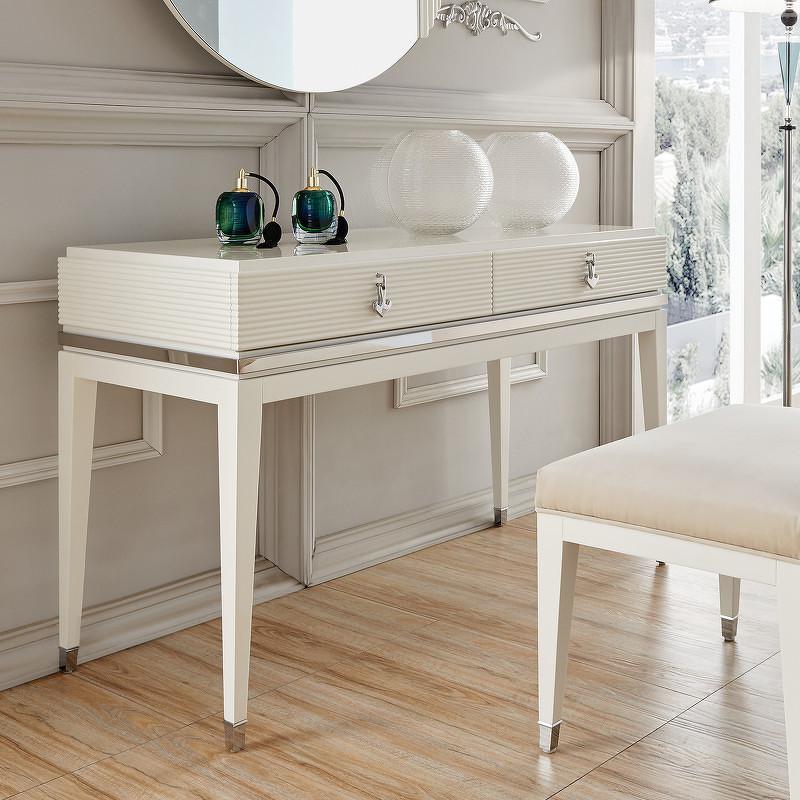 Туалетный столик с двумя выдвижными ящиками от итальянского бренда Fratelli Barri. Украшением данной модели являются рифленые фасады, металлические вставки и дизайнерские ручки. Отделка стола - белый глянцевый лак. Цвет фурнитуры - хром. На ножках металлические колпачки. Столик выполнен из массива дерева и высококачественного МДФ класса Е1. Ящики оснащены доводчиками для плавного закрывания. Дно ящиков декорировано черной бархатной тканью.
