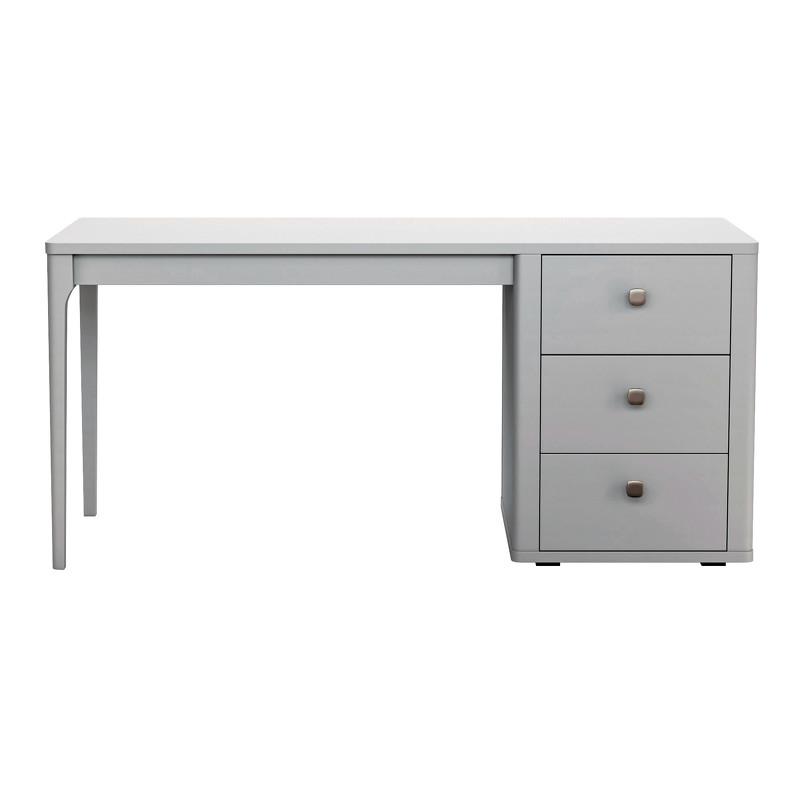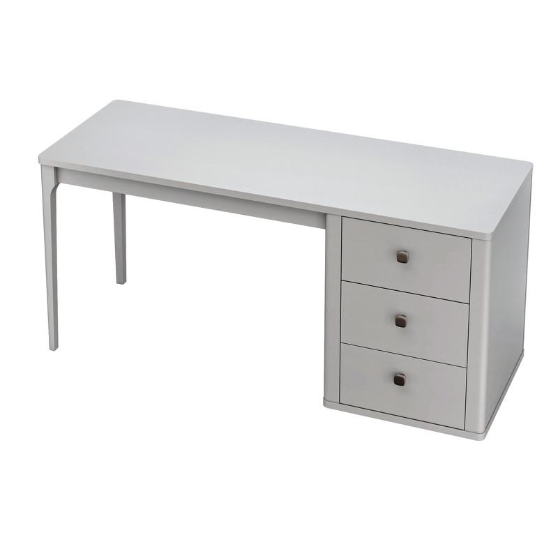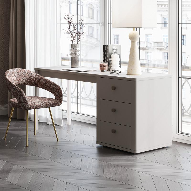 Письменный стол от итальянского бренда Fratelli Barri. Модель имеет тумбу с тремя ящиками и изящный силуэт за счет отсутствия задней стенки и замены второй боковины элегантными ножками. Изготовлен из высококачественного МДФ класса E1, ножки массив березы. Направляющие скрытого монтажа с демпфированием для плавного закрывания (soft closing). Ручки цвет бронза.