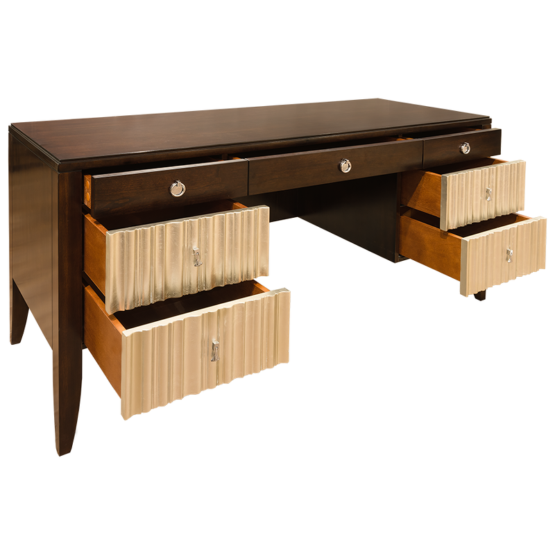 Письменный стол с 7 ящиками в стиле неоклассика от итальянского бренда Fratelli Barri. Модель имеет фронтальную часть в отделке серебряным напылением. К модели можно подобрать идентичную по дизайну прикроватную тумбочку, кровать, консоль и другую мебель. Каркас — массив дерева и высококачественная МДФ высокой плотности, отделка — натуральный шпон вишни. Все выдвижные ящики снабжены направляющими. Ширина стола — 160 см. Модель принадлежит к коллекции мебели Mestre в стиле неоклассика от Fratelli Barri. Здесь вы можете найти мебель для гостиной, столовой и спальни: сотни вариантов доступны для комбинации друг с другом.