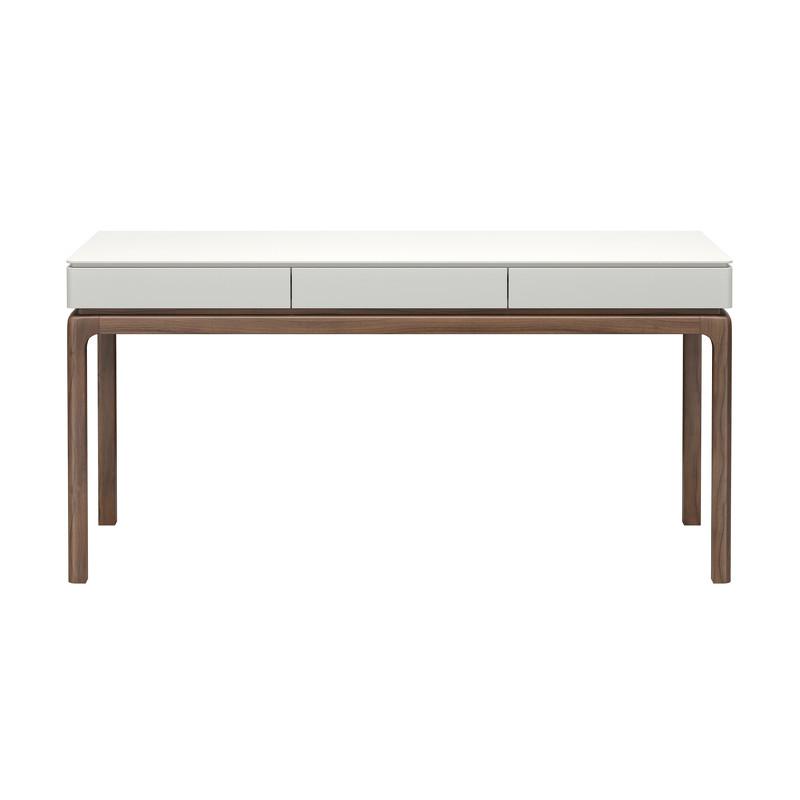 Письменный стол с тремя выдвижными ящиками от бренда Mod Interiors. Закругленные углы и тонкая столешница придают столу изысканный вид. Корпус и столешница выполнены из высококачественного сертифицированного МДФ высокой прочности в отделке матовый лак светло-серого оттенка. База из массива дерева в натуральном шпоне ореха. У стола 3 ящика со скрытыми направляющими и системой открывания push to open (открывание нажатием).