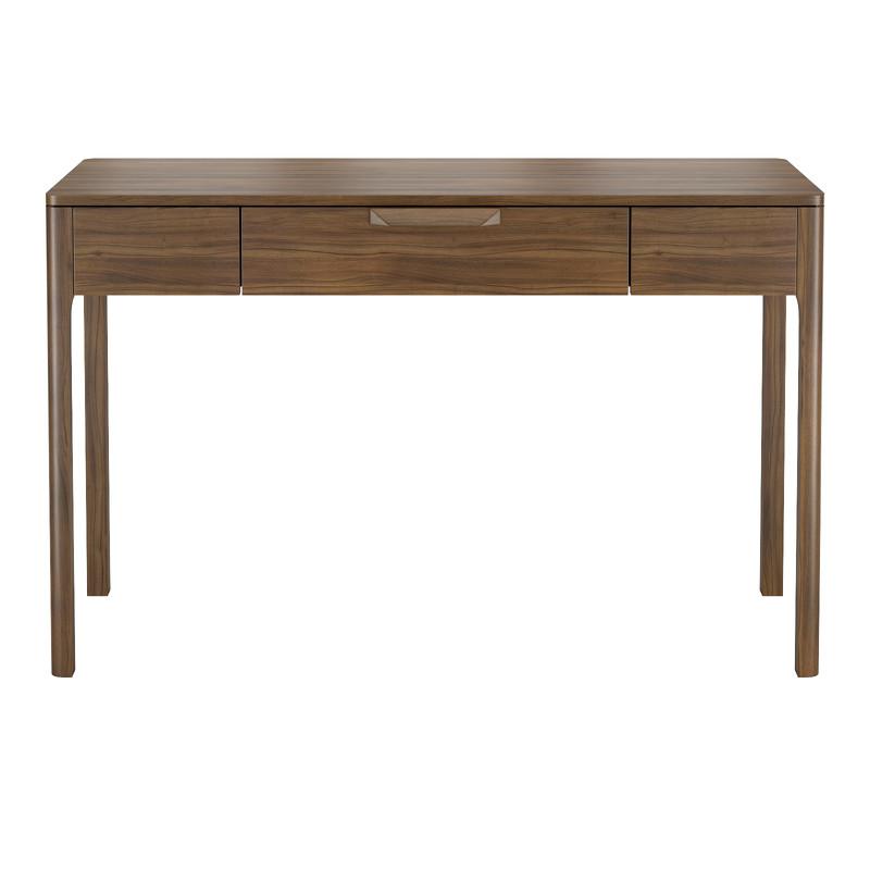 Письменный стол бренда MOD Interiors. Столешница изготовлена из высококачественного МДФ высокой плотности, ножки из массива дерева. Отделка - натуральный шпон американского ореха, одного из самых дорогих видов ореха. Стол в современном стиле, подходит для домашнего кабинета. Закругленные углы делают стол максимально безопасным, а 4 широкие ножки очень устойчивым. У стола 1 выдвижной ящик с направляющими системы soft-close. Уникальная система последнего поколения добавляет невероятную плавность открывания/закрывания. Ручка из массива дерева.