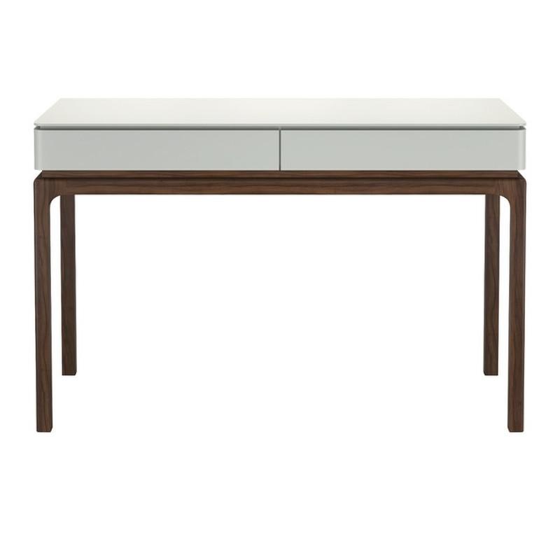 Туалетный столик с двумя выдвижными ящиками от бренда Mod Interiors. Столешница и корпус выполнены из высококачественного сертифицированного МДФ высокой прочности в отделке матовый лак светло-серого оттенка. База и ноги стола изготовлены из массива с покрытием из натурального шпона ореха. Ящики снабжены системой открывания push to open.