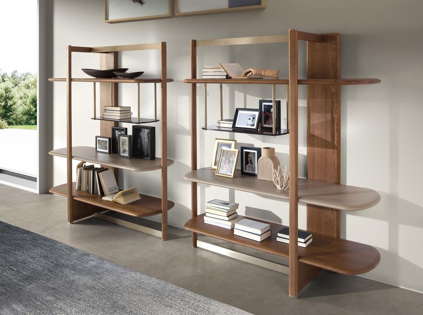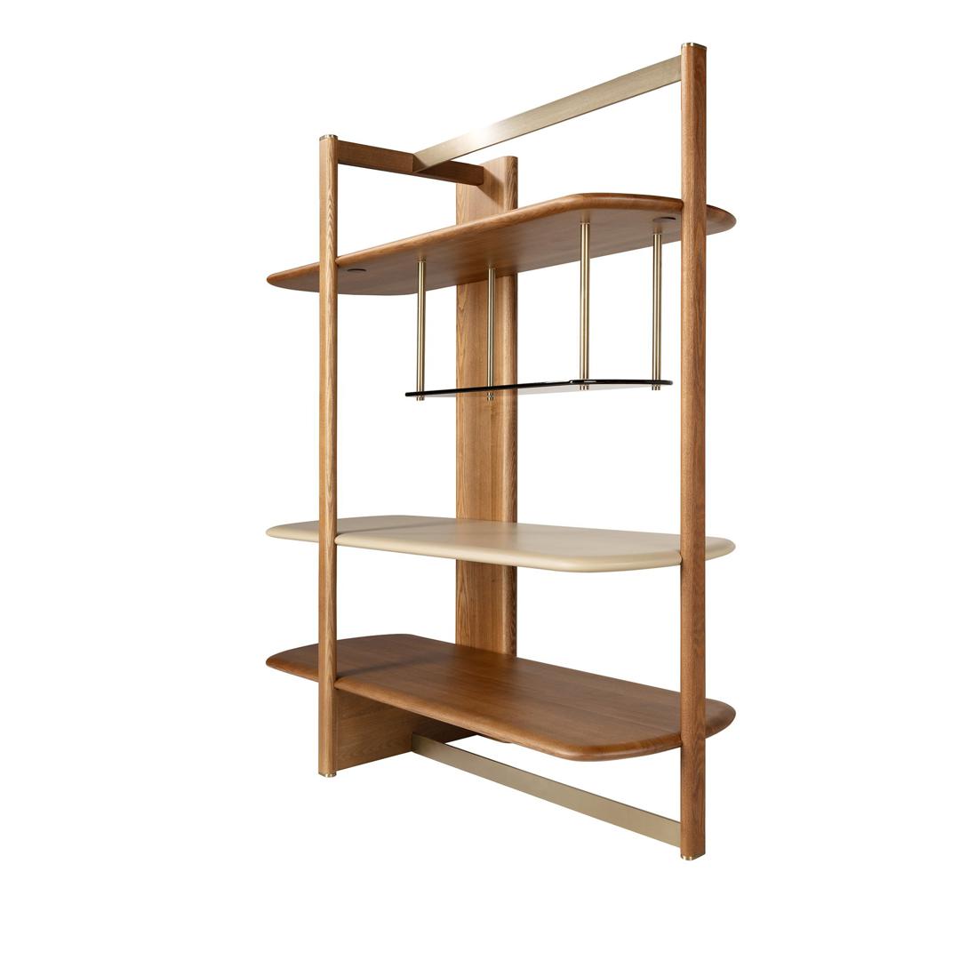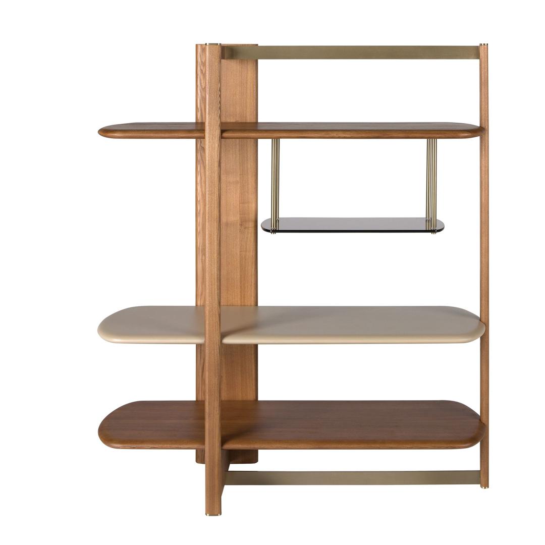 Современный стеллаж с каркасом и полками из светлого орехового дерева, дополненный полками из МДФ с серо-бежевым лаковым покрытием и полками из коричневого дымчатого стекла. Детали из полированной нержавеющей стали золотистого цвета создают элегантный контраст, придавая изделию сбалансированный и изысканный вид, идеально подходящий для гостиных и современных интерьеров.