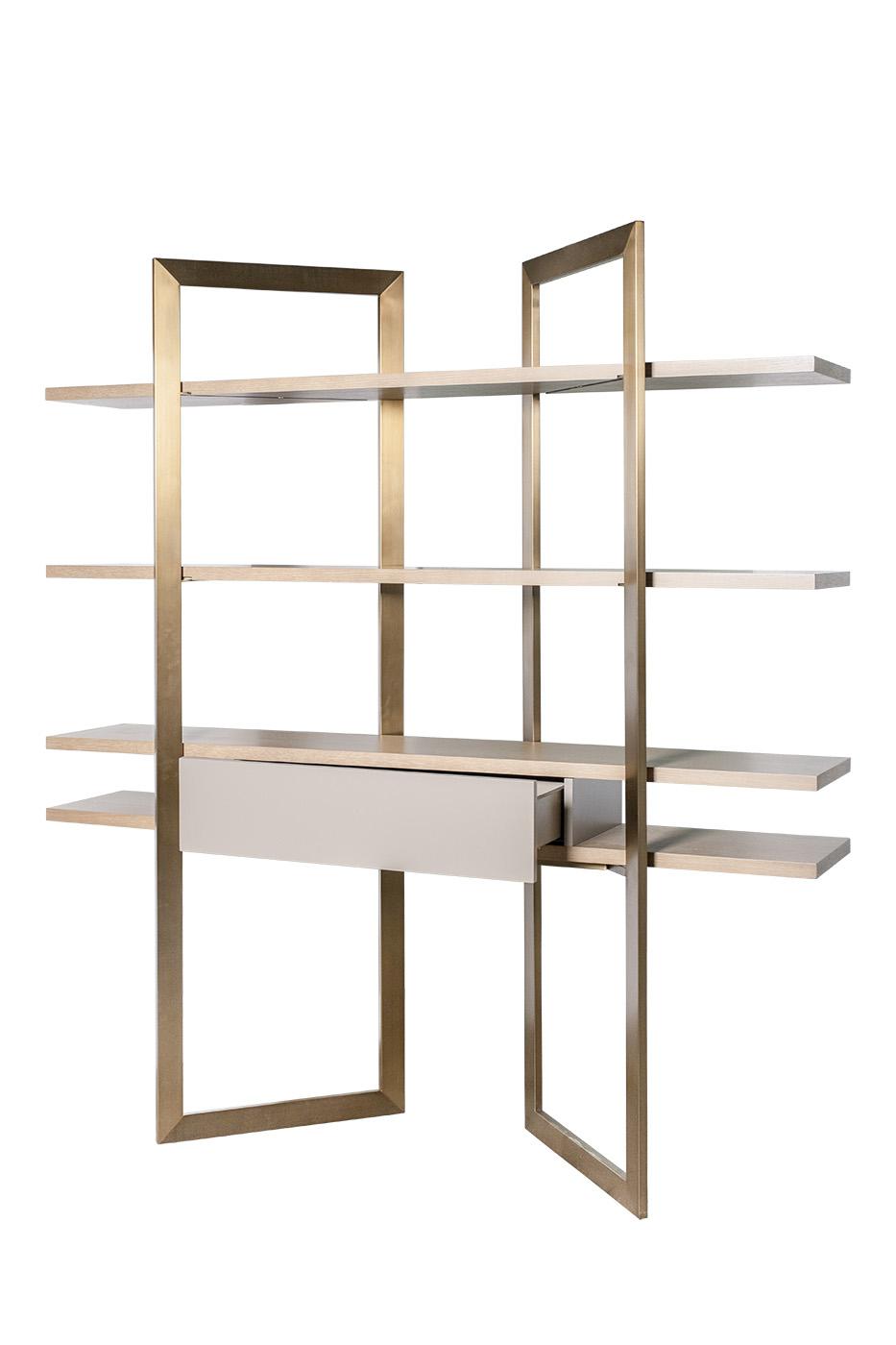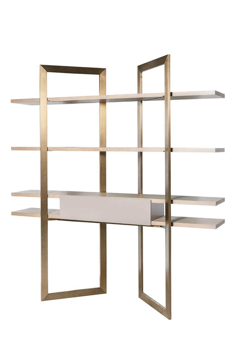 description-full - Эффектный стеллаж в гостиную в современном стиле отлично справляется с функциями места для хранения документов, бытовой техники, сувениров и книг, а также украшает собой пространство, добавляя ему изящества. Лаконичный стеллаж с полками визуально легкий за счет открытой конструкции и светлых оттенков шпона. Элегантности ему добавляют опоры из металла с золотистым блеском. Универсальный дизайн позволяет использовать металлический стеллаж для дома, квартиры и бизнес-интерьеров с высоким статусом. Он превосходно смотрится в гостиной, холле, прихожей, кабинете, столовой, легко сочетается с другими предметами обстановки в стиле ар-деко, неоклассики, минимализма.