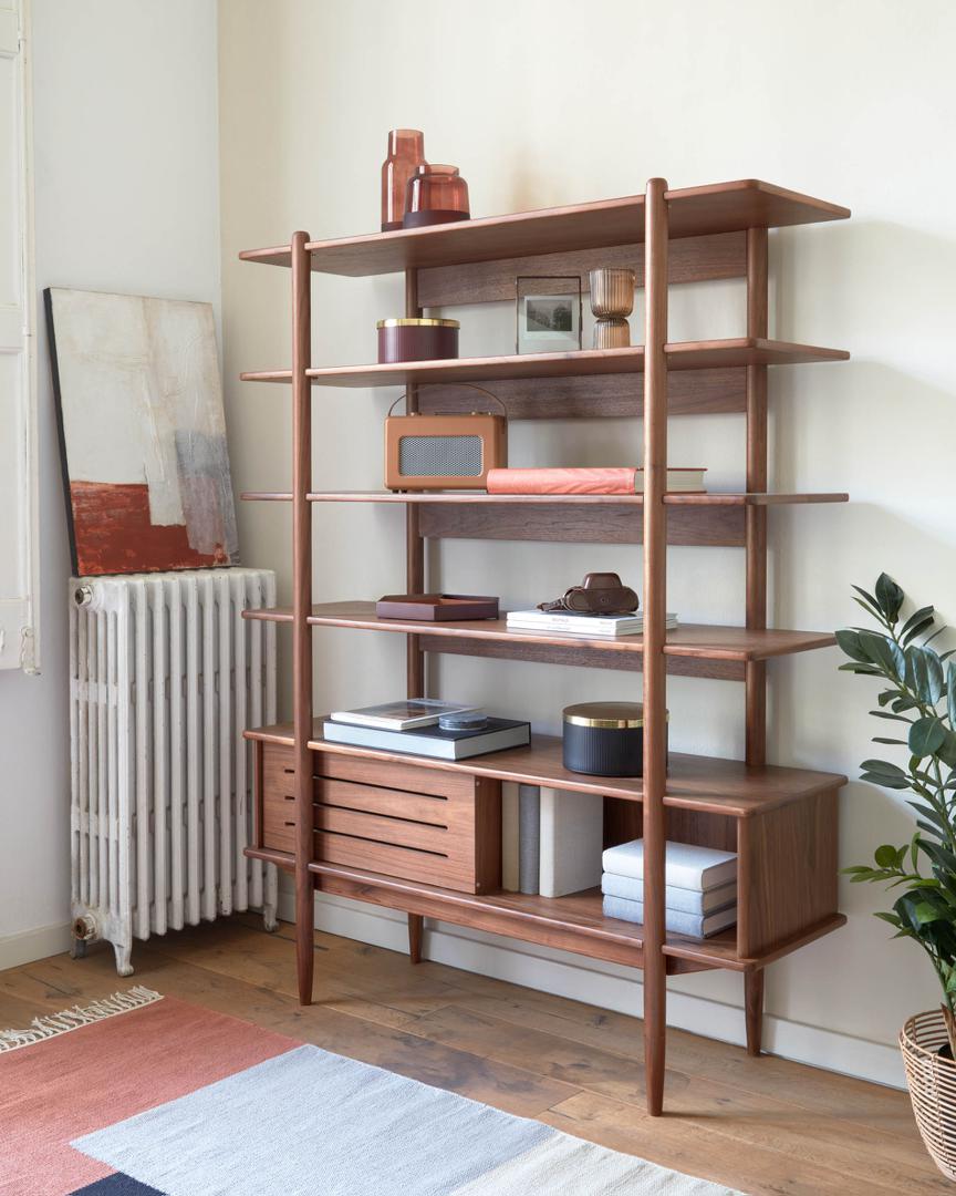 Стеллаж Carolin от фабрики La Forma (ex Julia Grup) – замечательный ретро-вид, который преобразит типовую городскую обстановку. Стеллаж Carolin – это дизайн, вернувшийся из 50-х годов прошлого столетия. И это мастер-класс о том, как сделать привычный современный интерьер особенным, а место для хранения домашних аксессуаров привлекательным и практичным. Модель Carolin исполнена просто идеально. В ней не может быть сомнений. Стеллаж имеет сборную конструкцию, которая сделана из древесины ореха, МДФ и шпона. Она состоит из четырех опор толщиной по 4 см (массив ореха), между которыми закреплены 4 полки и тумба с выдвижной дверью. Ножки имеют войлочные накладки, которые защищают напольное покрытие от деформации. Все элементы покрыты прозрачным лаком, который защищает поверхность от загрязнений, влаги. Полки все одинакового размера, толщиной по 2,5 см. Максимальная нагрузка на каждую полку не должна превышать 20 кг. Суммарная нагрузка на стеллаж – не более 75 кг. Размеры: ширина – 130 см, высота – 169 см, глубина – 33 см. Вес изделия – 53 кг. Сборка осуществляется самостоятельно. В коллекцию Carolin также входит буфет, тумба под ТВ в аналогичном дизайне.