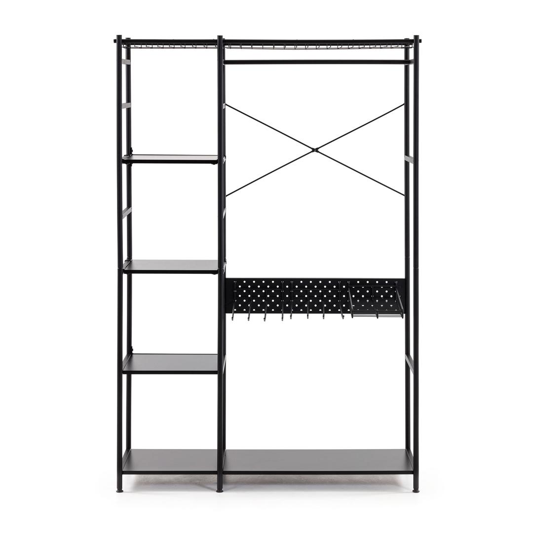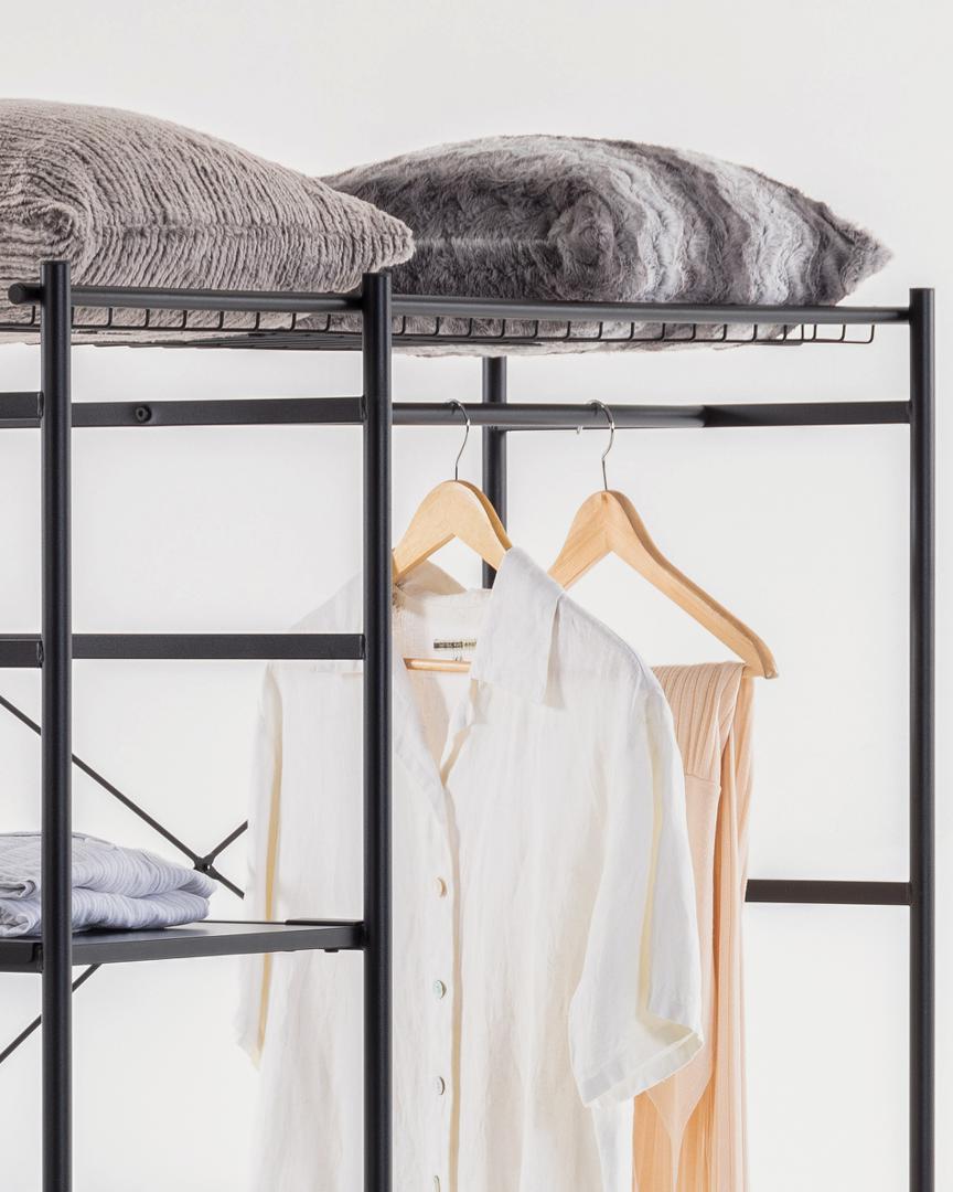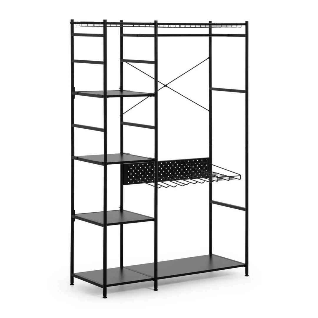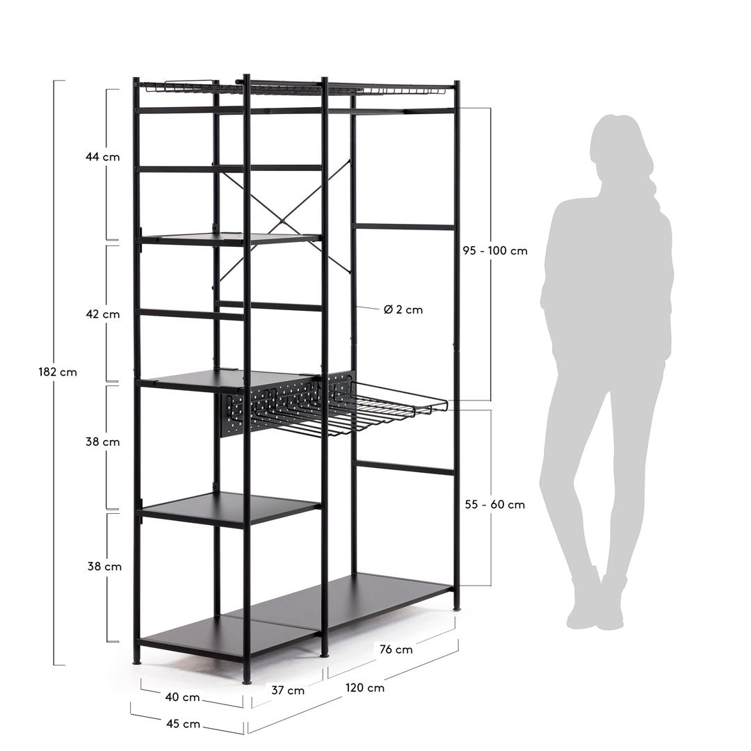 Шкаф Storn от фабрики La Forma (ex Julia Grup) – продуманный дизайн для всех видов одежды. Шкаф Storn – это урбанистическая конструкция, которая полностью заточена под потребности современного жителя мегаполиса. Только практичность и функционал – главные концепции этой мебели. Шкаф не имеет корпуса и дверей, поэтому все нужное будет сразу на виду. Отличная экономия времени, не правда ли? Проверьте сами! Конструкция шкафа собрана из металлических трубок диаметром 2 см. Она дополнена кронштейнами, вешалками для брюк и рубашек, четырьмя полками, не считая основания. Полки сделаны из древесностружечной плиты, выдерживают нагрузку до 3 кг. Шкаф полностью окрашен в черный матовый цвет. Покрытие увеличивает срок эксплуатации изделия, улучшает эстетический вид. На ножках есть пластиковые накладки, которые защищают напольное покрытие от повреждений. Суммарно шкаф выдерживает максимальную нагрузку в 30 кг. Размеры: ширина – 120 см, высота – 182 см, глубина – 45 см. Вес изделия – 26 кг. Конструкция не предполагает расширения, регулировку по высоте. Потребуется сборка. Инструкция включена в комплектацию.