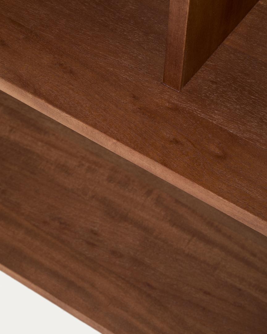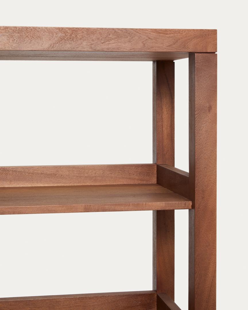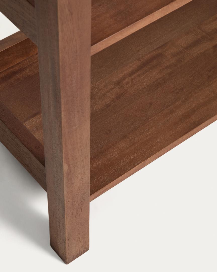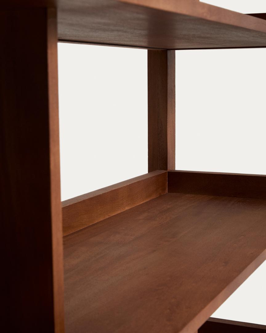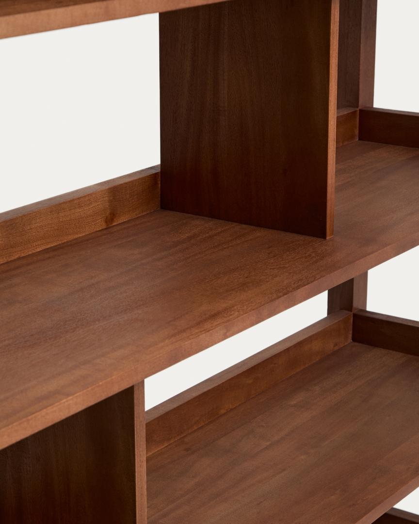 Стеллаж Norani изготовлен из массива акации с матовой отделкой, которая позволяет увидеть текстуру и вариации древесины, придавая ему глубину и спокойный вид. Его дизайн сочетает открытые полки с вертикальными отделениями, создавая сбалансированный визуальный ритм и предлагая достаточно места для хранения книг и предметов в порядке, не теряя при этом легкости. Регулируемые ножки позволяют адаптировать стеллаж к любым неровностям пола, обеспечивая устойчивость и компактность.