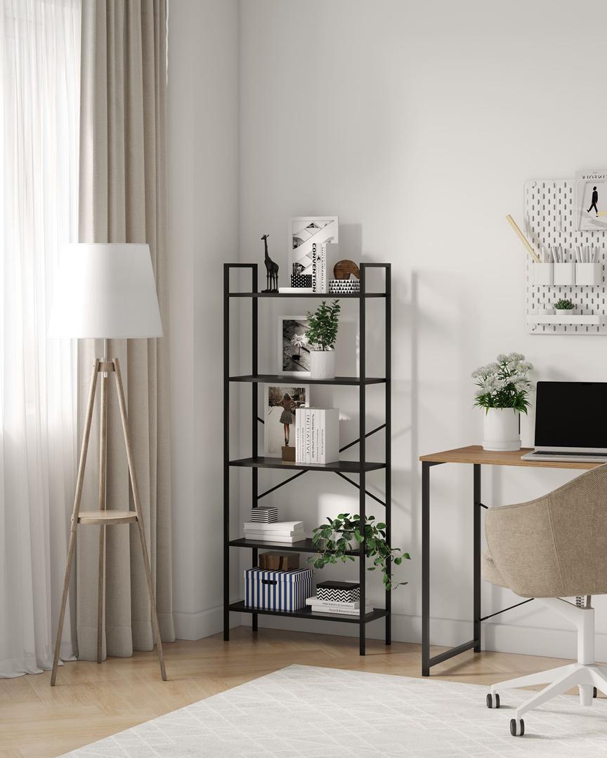 Компактный стеллаж на 5 полок Leset Стилвуд — практичный и стильный элемент для дома и офиса. Каркас из металлического профиля 1,5 см, толщина 0,1 см с порошковым покрытием обеспечивает жёсткость и долговечность; крестовина жесткости и крепление к стене добавляют стабильности и безопасности. Полки из ЛДСП толщиной 1,6 см легко чистятся, устойчивы к царапинам и выдерживают до 20 кг каждая. Нижняя полка имеет возможность крепления на разных высотах — удобно для высоких вещей или создания композиции. Маленькая плоская упаковка делает стеллаж лёгким в переноске и сборке. Универсальный дизайн впишется в любой интерьер: 4 декора (чёрный, дуб крафт, орех, белый) и 2 цвета каркаса (белый, чёрный).
