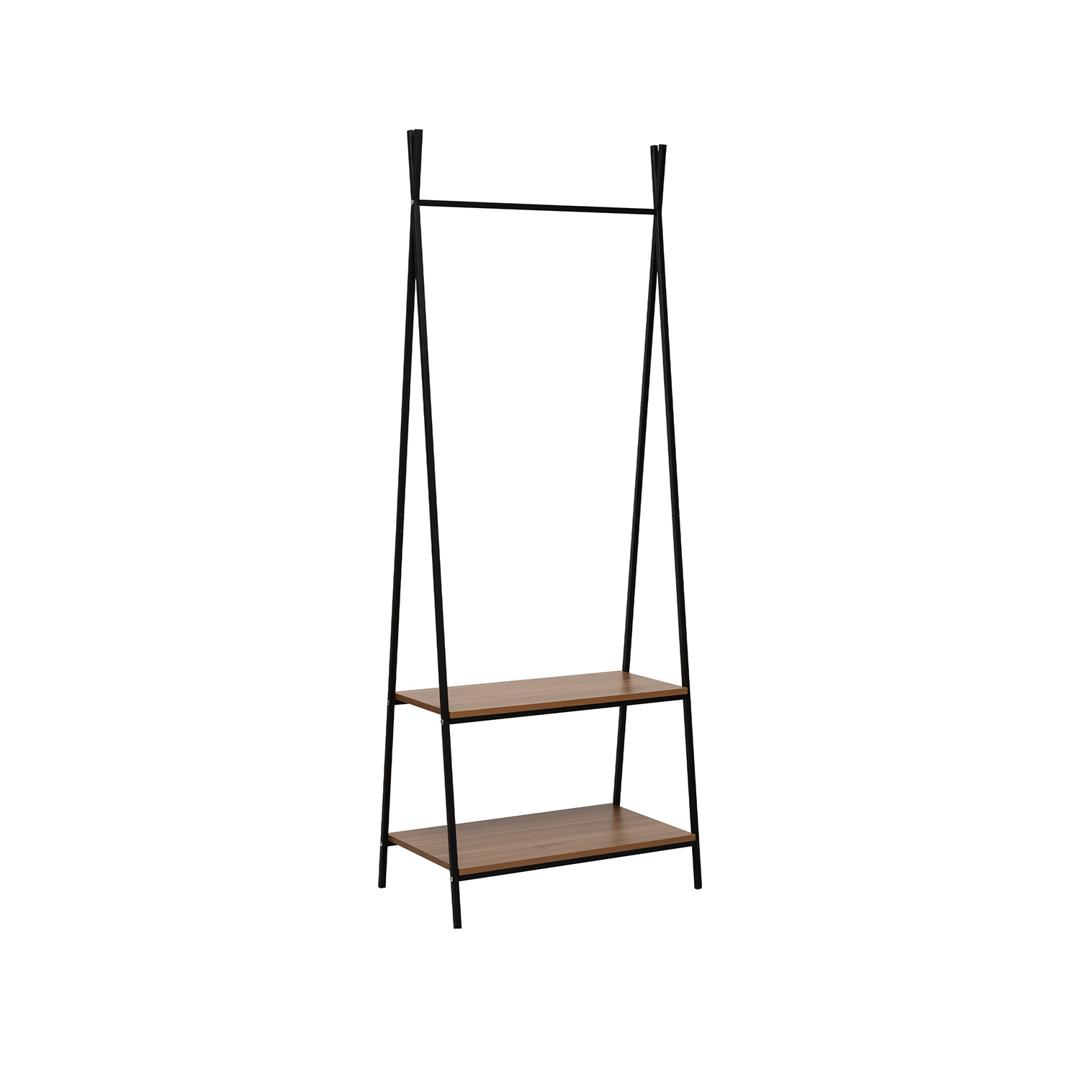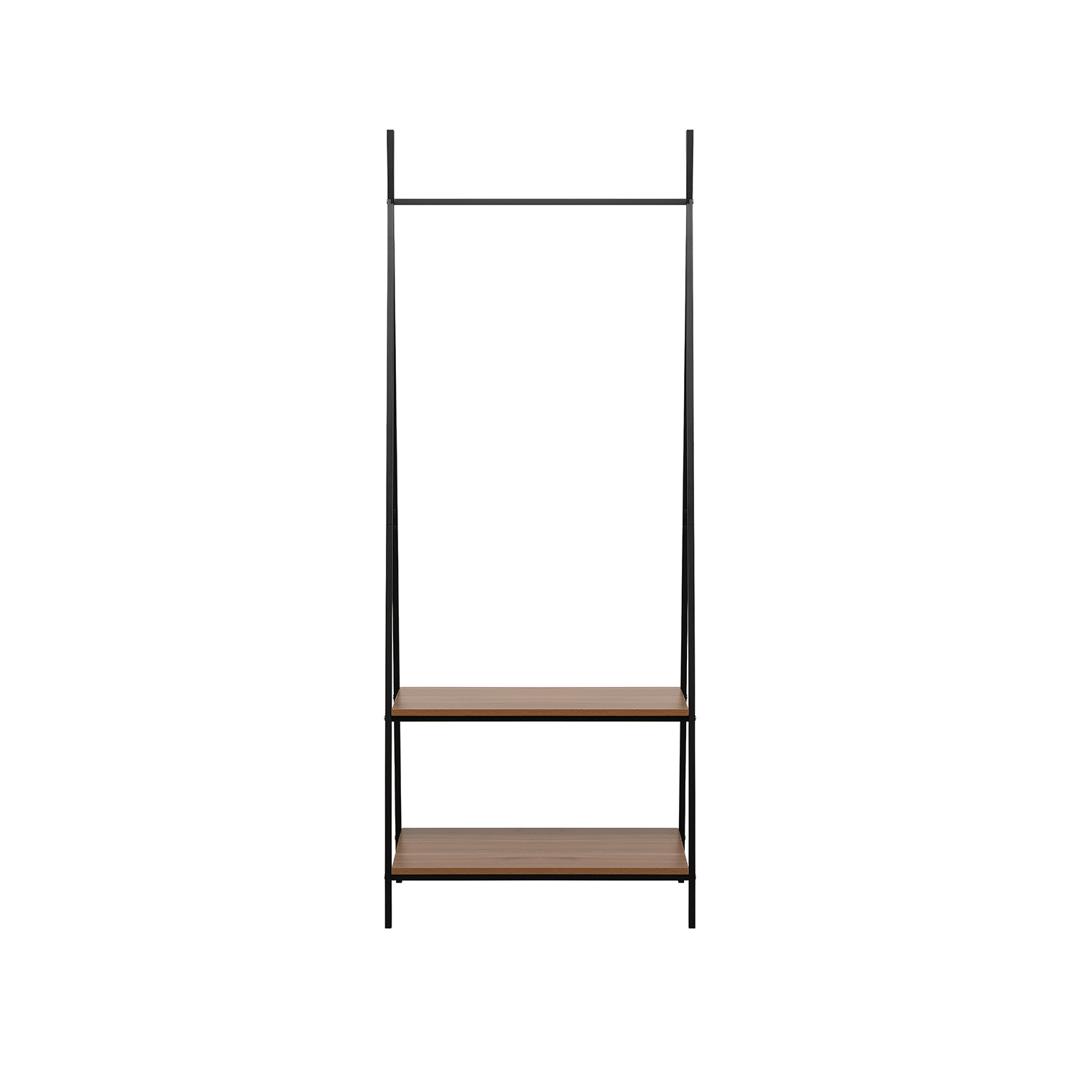 Компактная вешалка Leset Стилвуд станет настоящим помощником в организации пространства прихожей. Она упорядочит верхнюю одежду и аксессуары, сэкономит ваше время при сборах и освободит драгоценные квадратные метры в небольшой прихожей. Прочная металлическая рама оснащена удобной перекладиной для плечиков и двумя вместительными полками для обуви и сумок. Всё необходимое всегда под рукой. Вешалка собирается за 10 минут и отличается устойчивостью даже при интенсивной ежедневной эксплуатации. Минималистичный дизайн в стиле лофт придаст интерьеру особый стиль и продуманность. Высокая, но узкая конструкция идеально подходит для небольших пространств, при этом позволяя разместить более 10 вешалок. Два уровня полок помогут систематизировать обувь, коробки и аксессуары. Чёрная металлическая рама в сочетании с коричневыми, белыми и черными деревянными полками создаёт эффектный контраст и органично вписывается как в современные, так и в классические интерьеры.