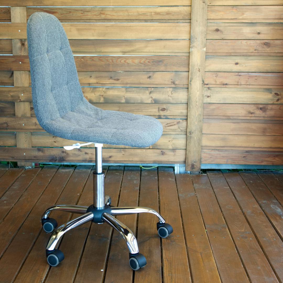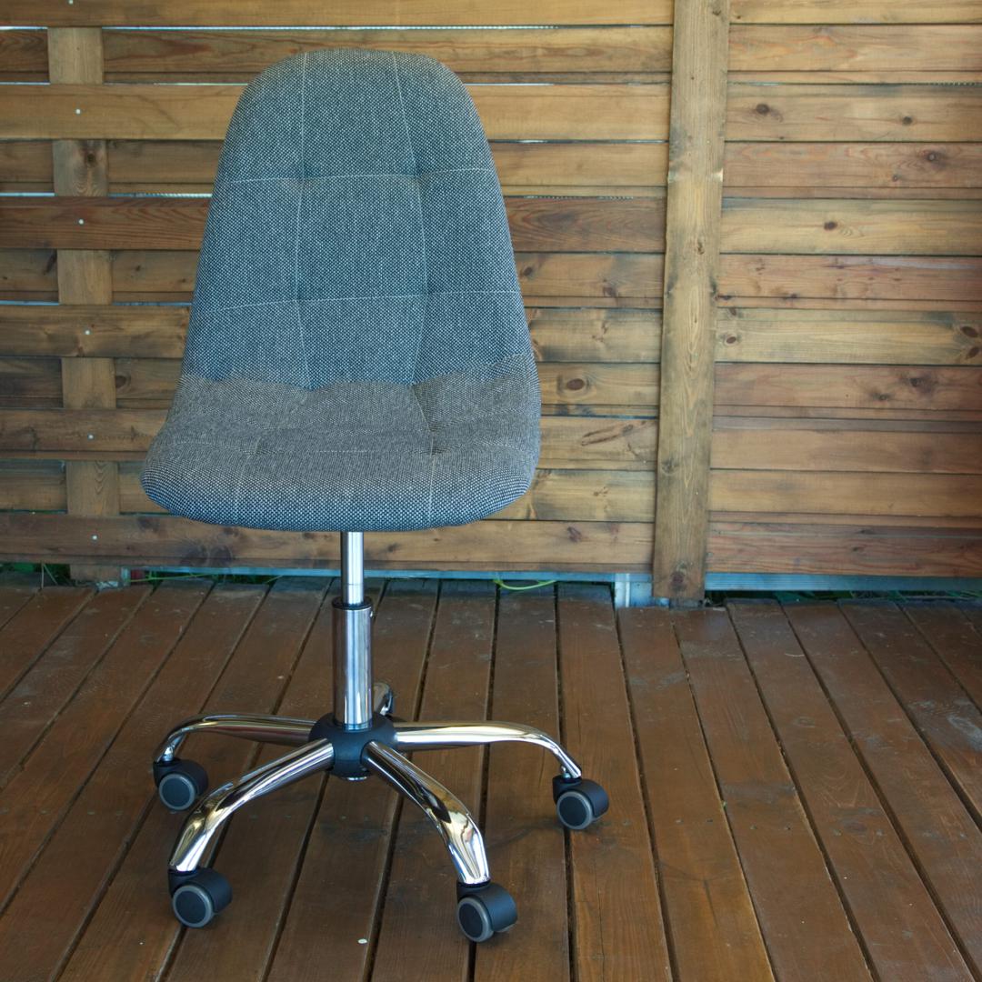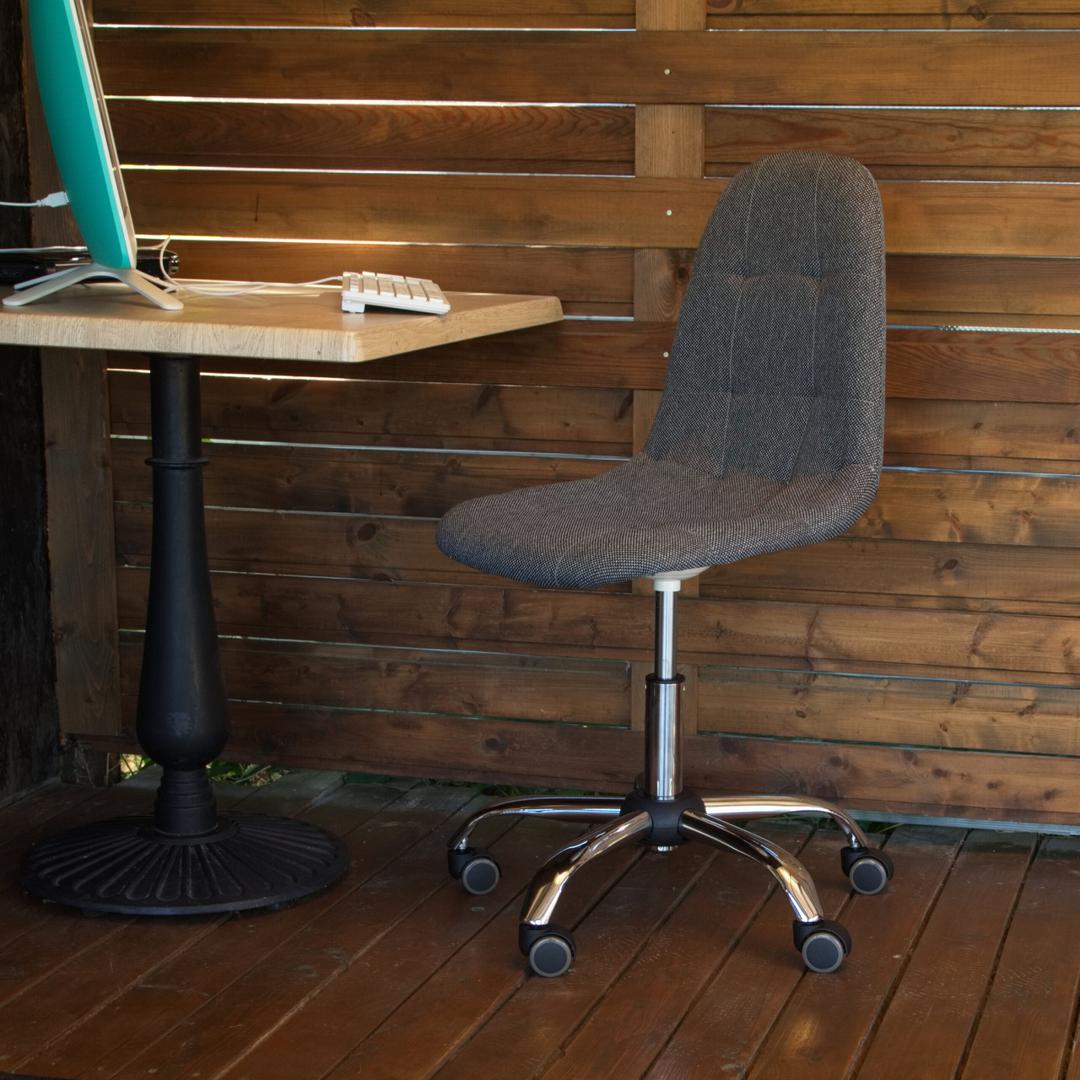Современный компьютерный стул Пуффи удобный, прочный и красивый.Каркас из прочной фанеры, обивка из модной графитовой рогожки.Вращение на 360° и регулировка по высоте.Обрезиненные ролики для бесшумного перемещения.