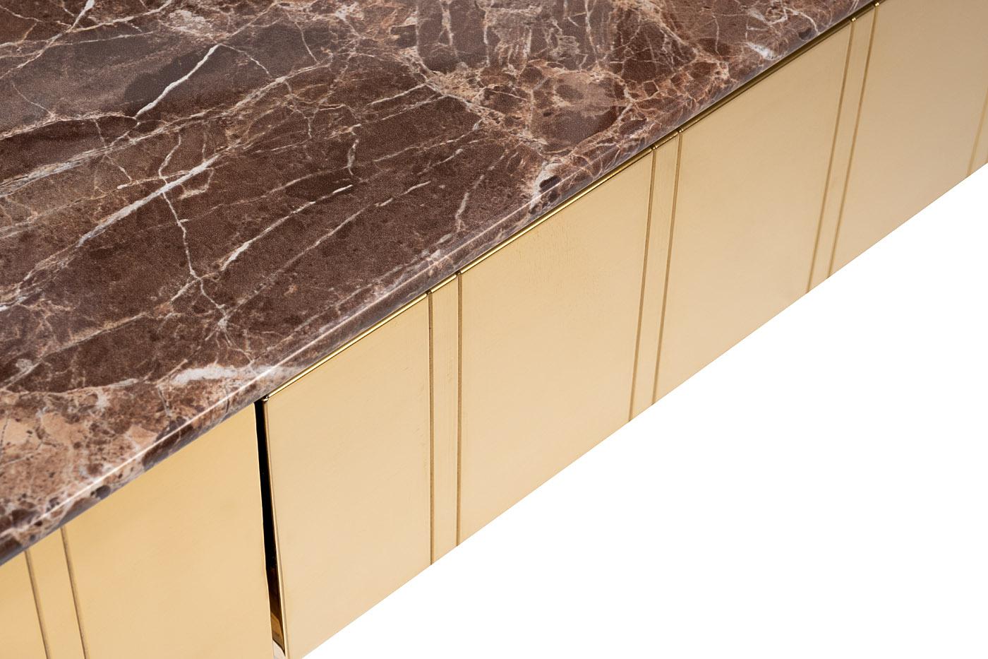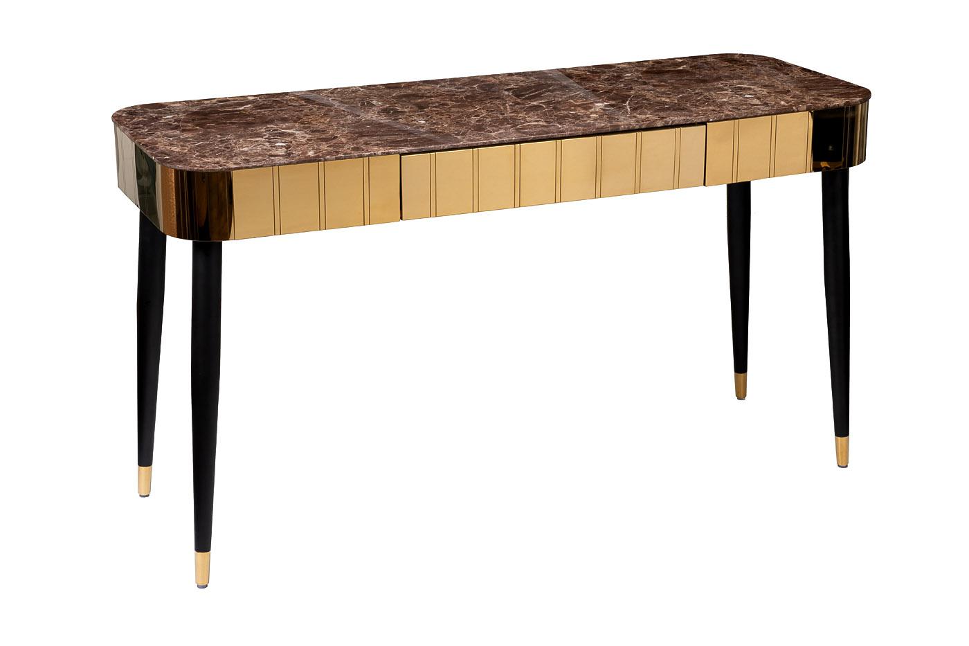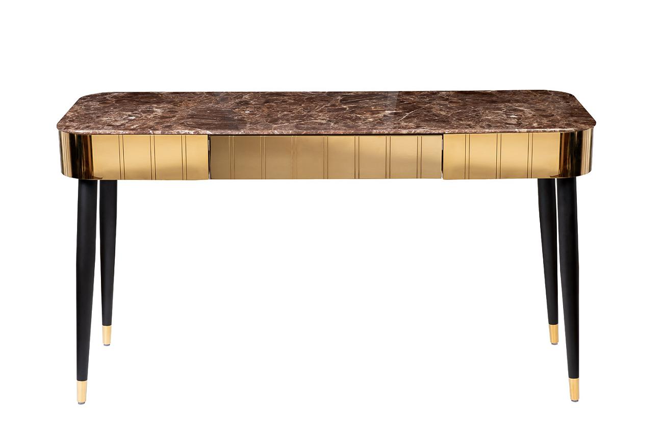 description-full - Дизайнерский письменный стол поможет не просто организовать удобное и функциональное рабочее место, но и задать тон всему интерьеру кабинета или гостиной. Сочетание позолоченной нержавеющей стали и столешницы под мрамор выглядит дорого и аристократично, и при этом обеспечивает долгий срок службы мебели. Если вы ищите нестандартный письменный стол для кабинета, эта модель будет отличным выбором. Контрастные черные ножки с небольшими «золотыми» наконечниками придают конструкции легкости, а фактура камня подчеркивает элегантность мебели. У нас вы можете купить письменный стол под мрамор, а также выбрать к нему стул для создания стильного рабочего пространства.