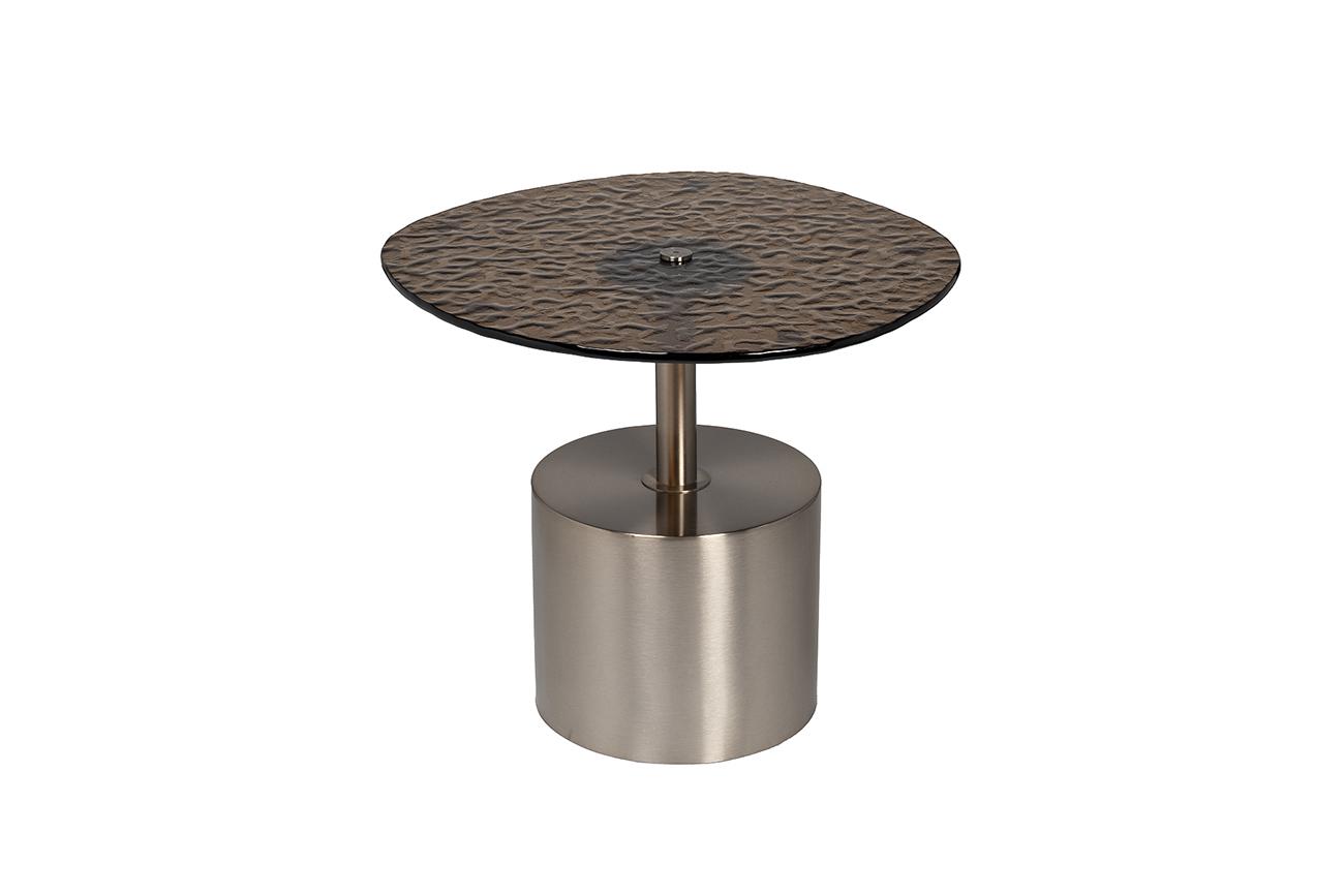 description-full - Этот журнальный столик из тонированного рельефного закаленного стекла привлекает внимание необычным сочетанием материалов и форм. Стеклянная столешница с текстурой, напоминающей поверхность льдины, создает эффект глубины, меняя оттенок в зависимости от освещения. Металлический каркас цилиндрической формы в благородном оттенке золото шампань обеспечивает устойчивость и подчеркивает авангардный стиль мебели. Компактные размеры делают его идеальным для гостиных, лаунж-зон и стильных интерьеров в духе modern luxe и арт-деко. Этот тонированный журнальный столик станет выразительным акцентом, добавляя пространству легкость и динамику. Толщина столешницы: 10мм. Сочетается со столиком 57EL-10852