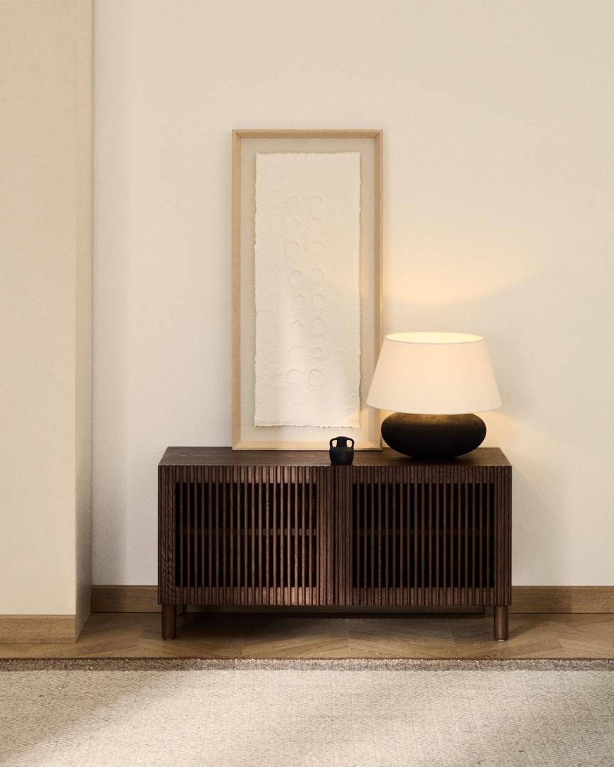 Полка для обуви из коллекции Beyla сочетает в себе изысканность ясеня и тщательно продуманный дизайн. Каркас выполнен из ясеневого шпона, а дверца и ножки – из массива дерева с элегантной отделкой цвета ореха. Дверца украшена вертикальными планками, которые создают визуальный ритм и позволяют свету создавать тонкие контрасты на поверхности. Петли с доводчиками обеспечивают бесшумное и удобное использование, а регулируемые ножки компенсируют неровности пола.