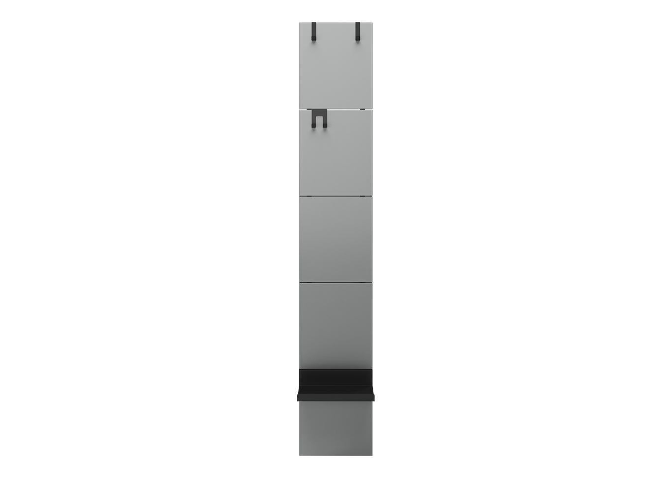 Вешалка Stripe L Комплект: - панель - крючок одинарный 2 шт - крючок двойной 1 шт - полка прямая 1 шт Габариты панели: - высота 1770 мм - ширина 300 мм Покрытие панели эмаль RAL 7035 Покрытие крючков и полок порошковая краска черный