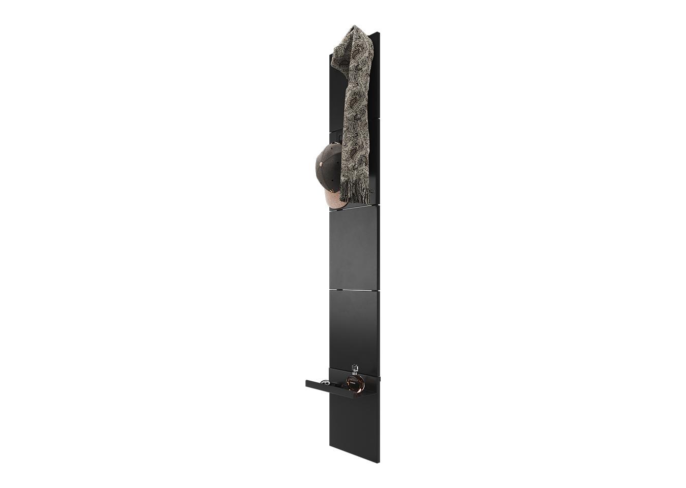Вешалка Stripe L Комплект: - панель - крючок одинарный 2 шт - крючок двойной 1 шт - полка прямая 1 шт Габариты панели: - высота 1770 мм - ширина 300 мм Покрытие панели эмаль RAL 9005 Покрытие крючков и полок порошковая краска черный