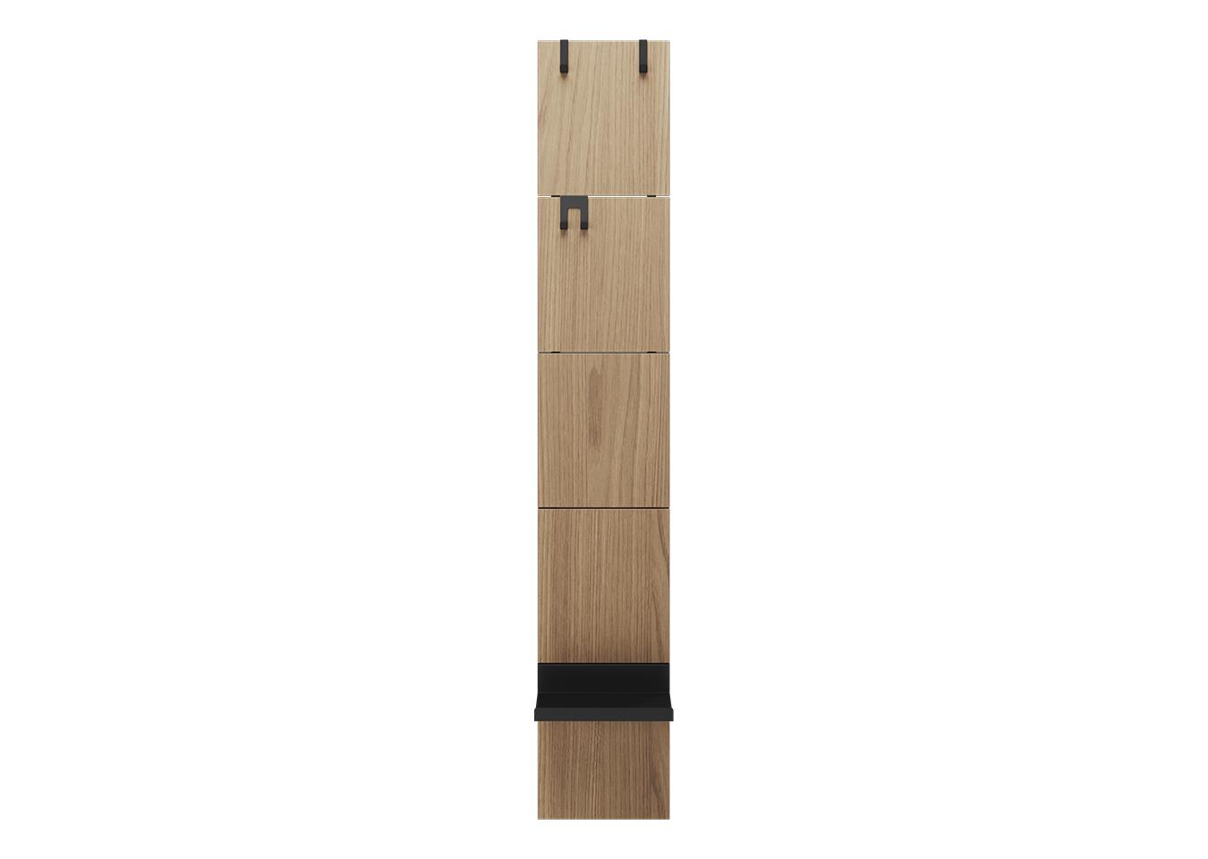 Вешалка Stripe L Комплект: - панель - крючок одинарный 2 шт - крючок двойной 1 шт - полка прямая 1 шт Габариты панели: - высота 1770 мм - ширина 300 мм Покрытие панели шпон дуба Покрытие крючков и полок порошковая краска черный