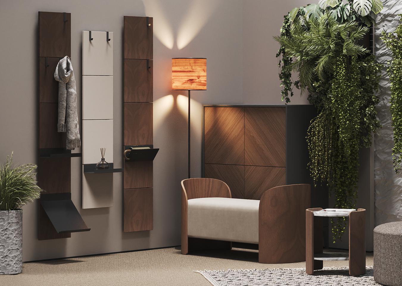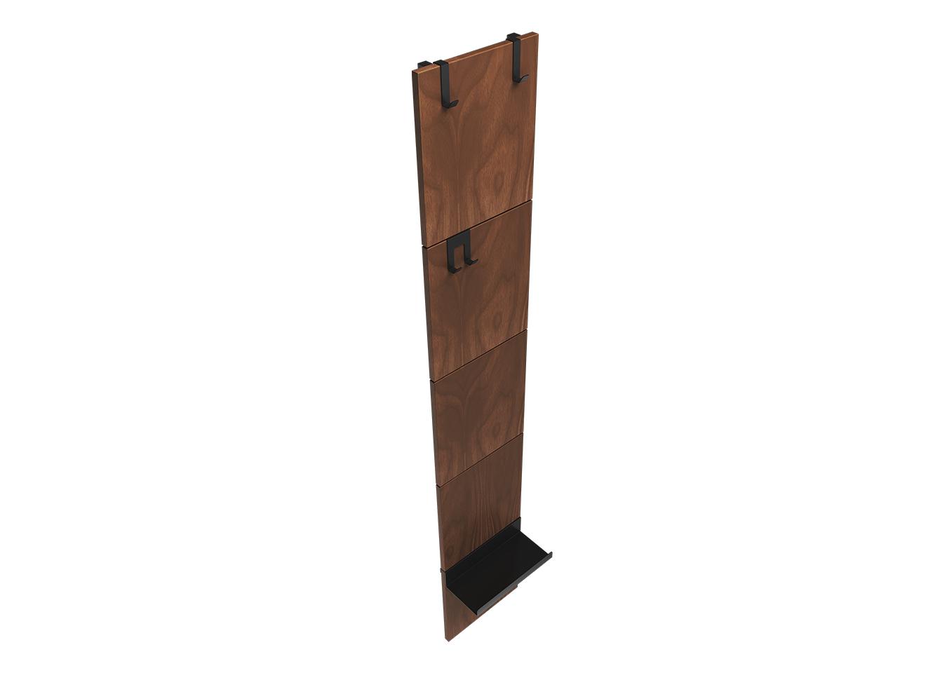 Вешалка Stripe L Комплект: - панель - крючок одинарный 2 шт - крючок двойной 1 шт - полка прямая 1 шт Габариты панели: - высота 1770 мм - ширина 300 мм Покрытие панели шпон ореха Покрытие крючков и полок порошковая краска черный