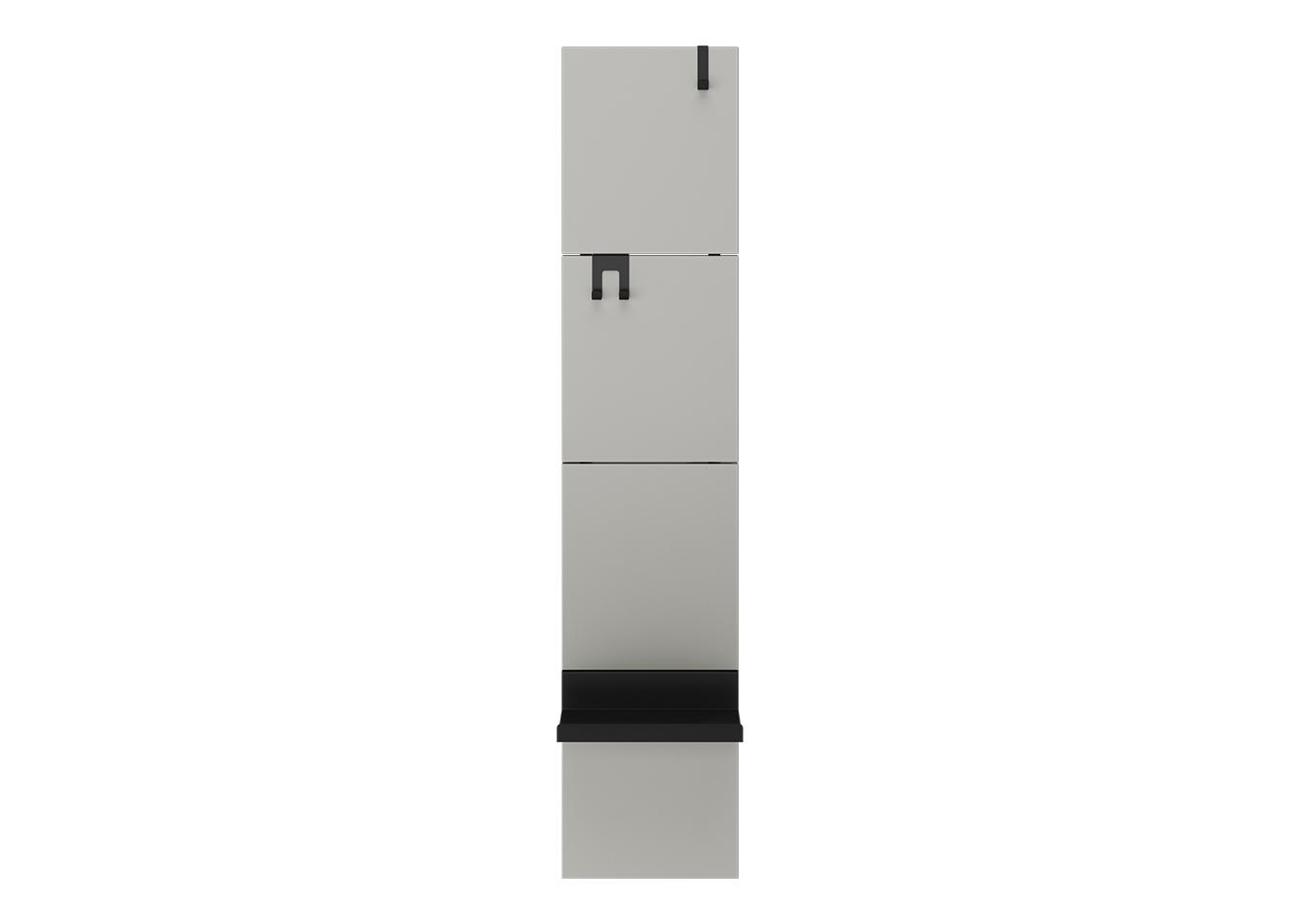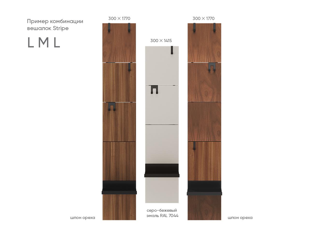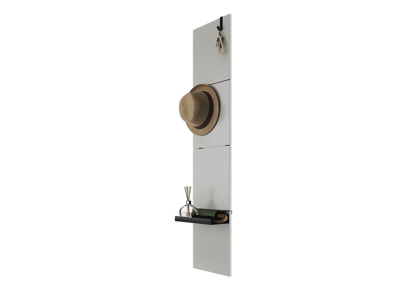 Вешалка Stripe M Комплект: - панель - крючок одинарный 1 шт - крючок двойной 1 шт - полка прямая 1 шт Габариты панели: - высота 1415 мм - ширина 300 мм Покрытие панели эмаль RAL 7044 Покрытие крючков и полок порошковая краска черный