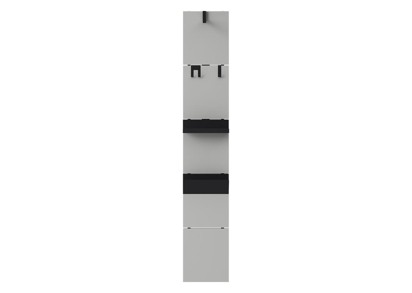 Вешалка Stripe L Комплект: - панель - крючок одинарный 2 шт - крючок двойной 1 шт - полка прямая 1 шт Габариты панели: - высота 1770 мм - ширина 300 мм Материал панелей ЛДСП, цвет серый (соответствует NCS S 3000-N / Pantone Warm Grey 6 C) Покрытие крючков и полок порошковая краска черный