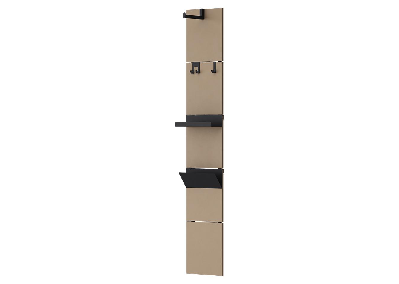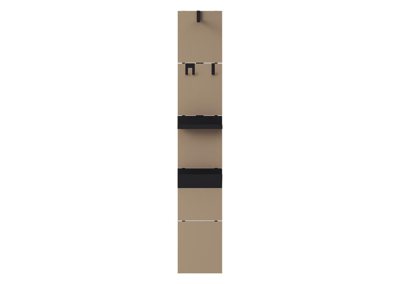 Вешалка Stripe L Комплект: - панель - крючок одинарный 2 шт - крючок двойной 1 шт - полка прямая 1 шт Габариты панели: - высота 1770 мм - ширина 300 мм Материал панелей ЛДСП, цвет капучино (соответствует NCS S 4010-Y30R / RAL 1019 / Pantone 7530 C) Покрытие крючков и полок порошковая краска черный