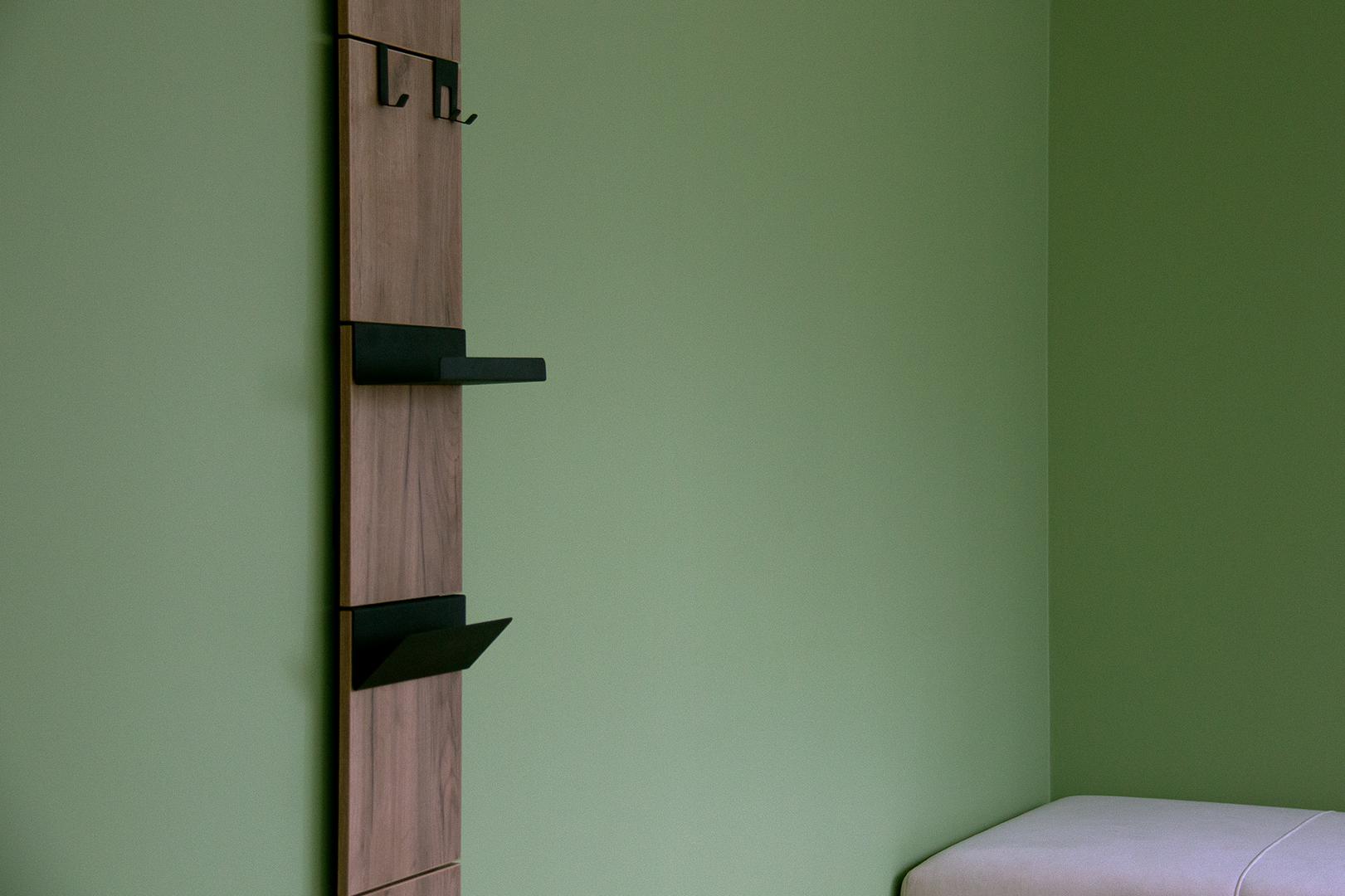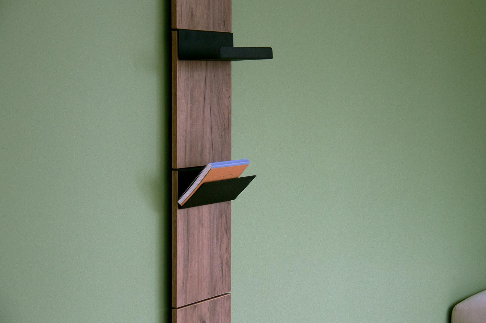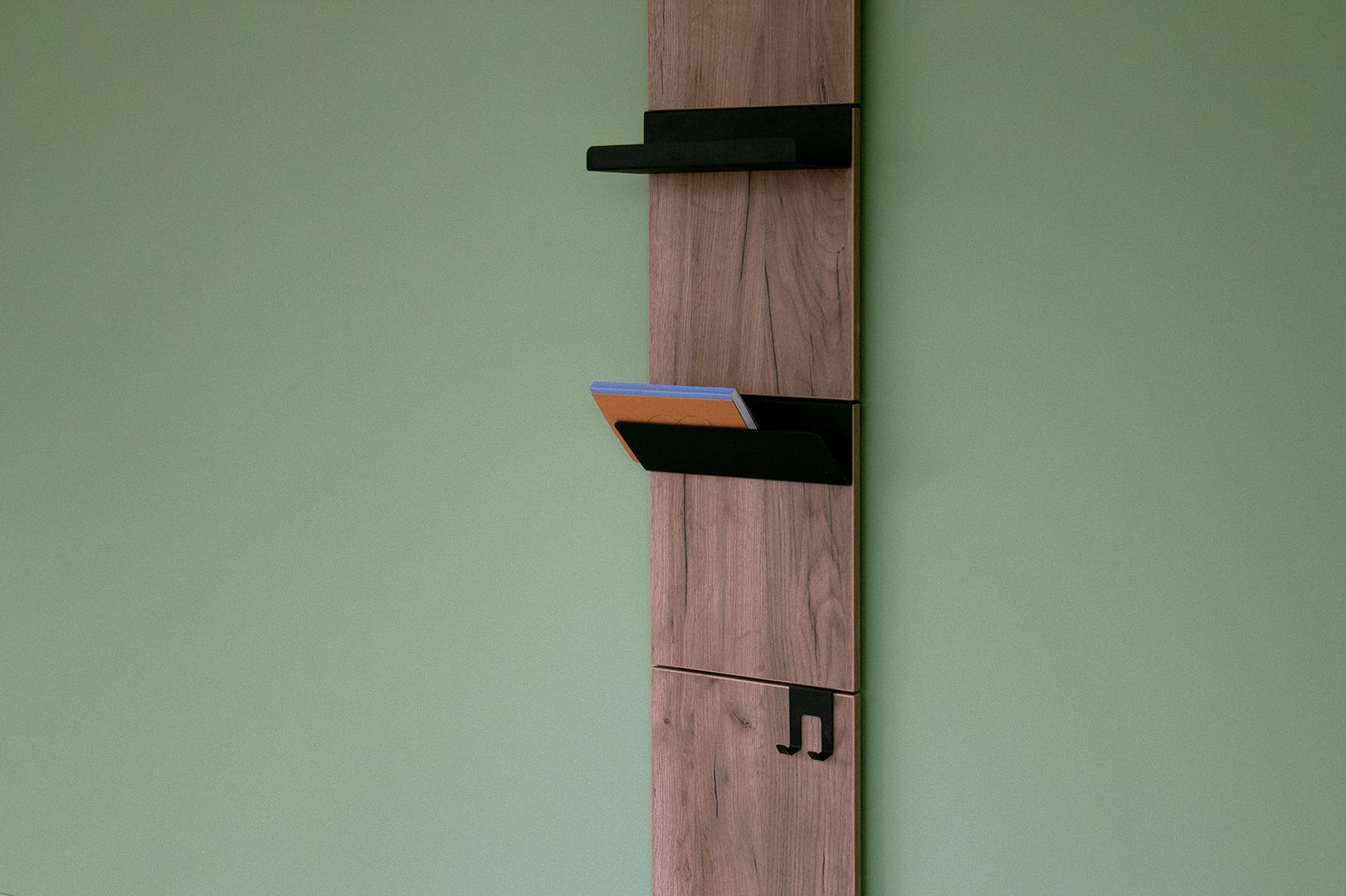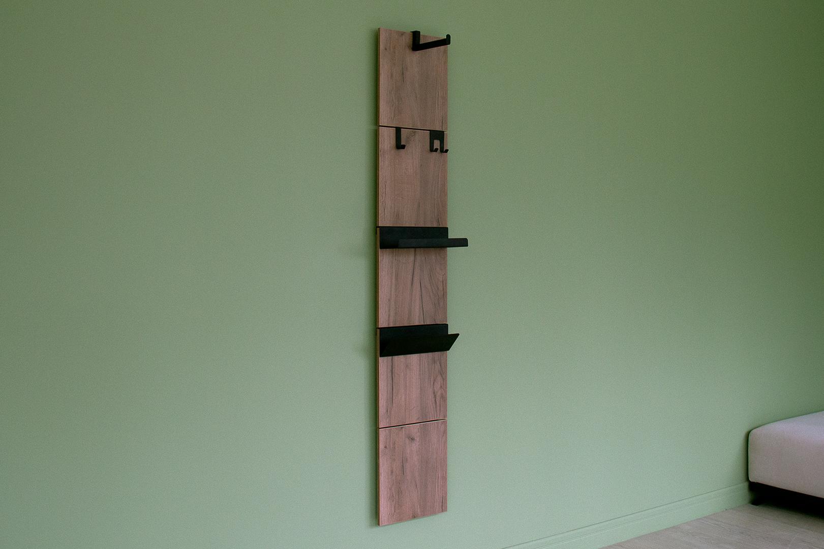 Вешалка Stripe L Комплект: - панель - крючок одинарный 2 шт - крючок двойной 1 шт - полка прямая 1 шт Габариты панели: - высота 1770 мм - ширина 300 мм Материал панелей ЛДСП, дуб крафт Покрытие крючков и полок порошковая краска черный