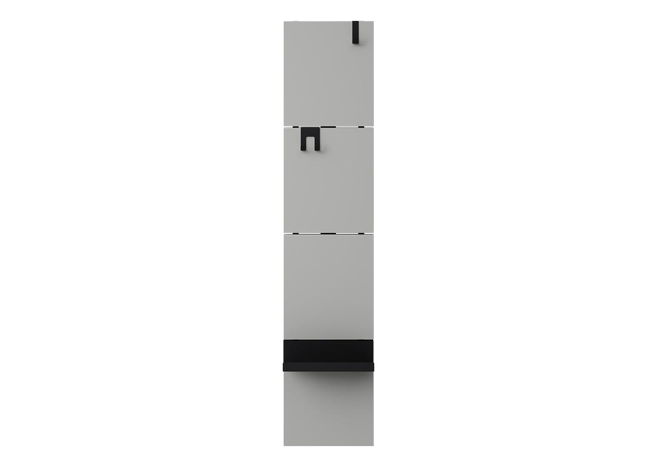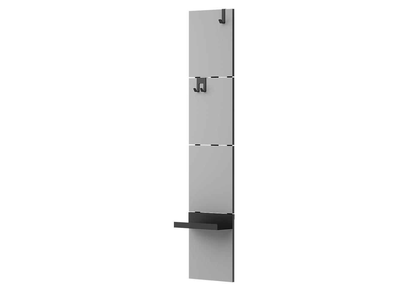 Вешалка Stripe M Комплект: - панель - крючок одинарный 1 шт - крючок двойной 1 шт - полка прямая 1 шт Габариты панели: - высота 1415 мм - ширина 300 мм Материал панелей ЛДСП, цвет серый (соответствует NCS S 3000-N / Pantone Warm Grey 6 C) Покрытие крючков и полок порошковая краска черный