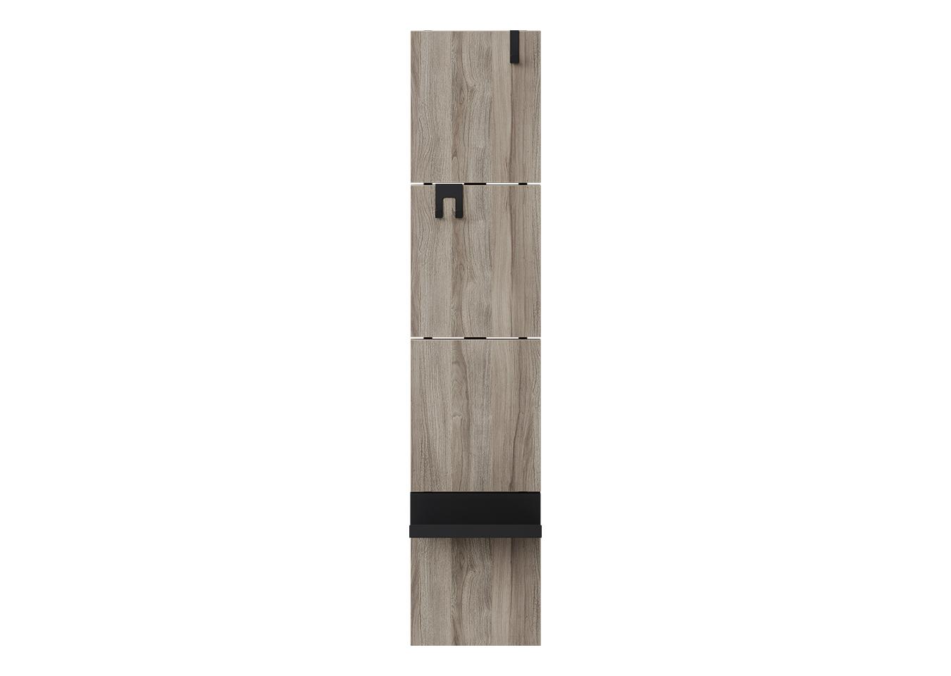 Вешалка Stripe M Комплект: - панель - крючок одинарный 1 шт - крючок двойной 1 шт - полка прямая 1 шт Габариты панели: - высота 1415 мм - ширина 300 мм Материал панелей ЛДСП, цвет вяз светлый Покрытие крючков и полок порошковая краска черный