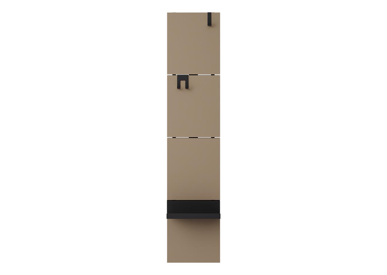 Вешалка Stripe M Комплект: - панель - крючок одинарный 1 шт - крючок двойной 1 шт - полка прямая 1 шт Габариты панели: - высота 1415 мм - ширина 300 мм Материал панелей ЛДСП, цвет капучино (соответствует NCS S 4010-Y30R / RAL 1019 / Pantone 7530 C) Покрытие крючков и полок порошковая краска черный