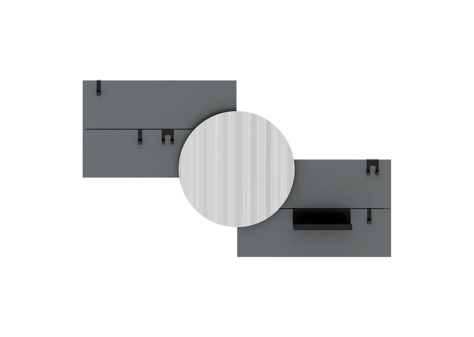 Вешалка Stripe M горизонтальная с зеркалом D 60 см Комплект: - панель 80*50,5 см 2 шт - зеркало D 60 см - крючок одинарный 3 шт - крючок двойной 2 шт - полка прямая 1 шт Покрытие панели эмаль RAL 7037 Покрытие крючков и полок порошковая краска цвет черный