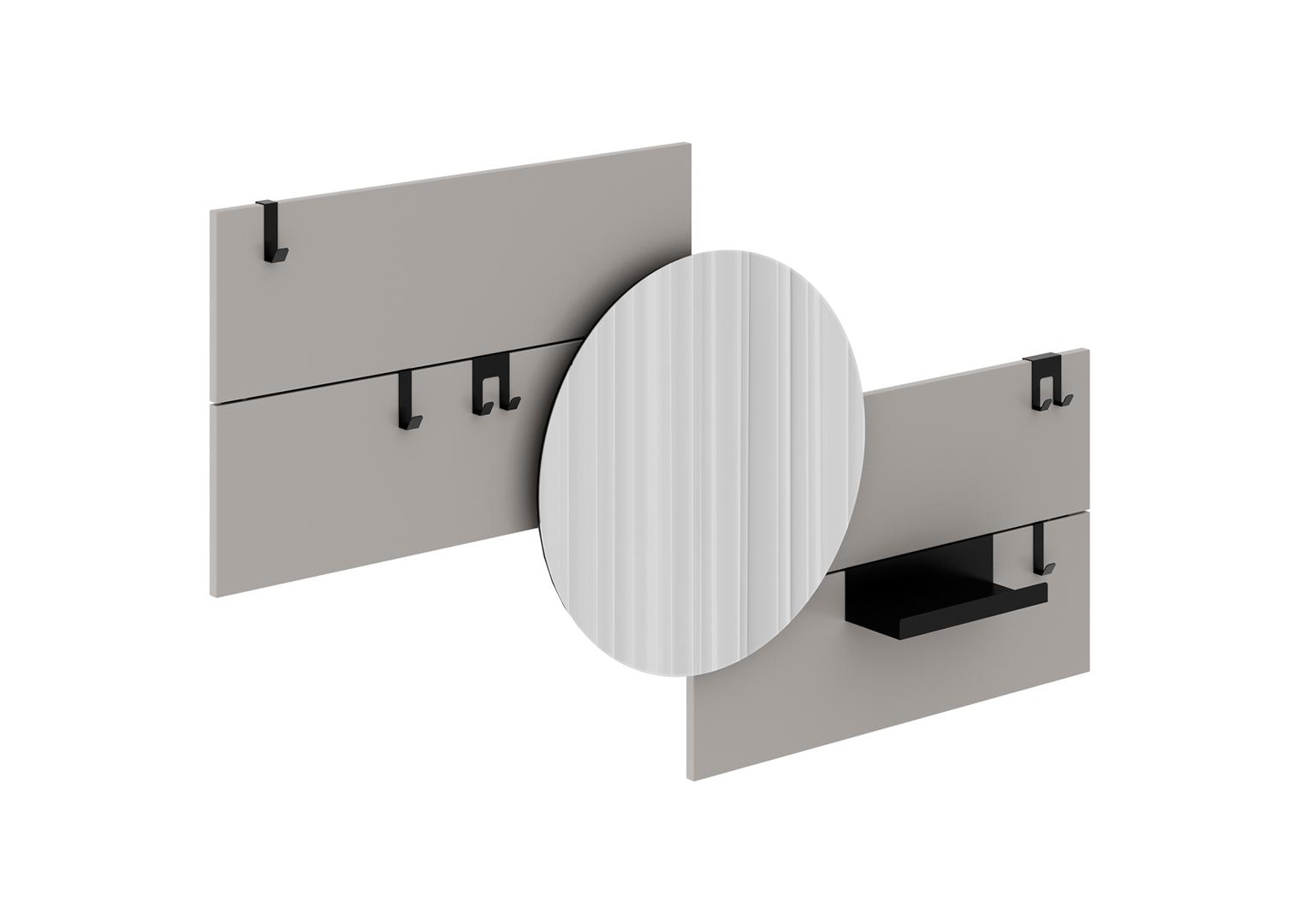 Вешалка Stripe M горизонтальная с зеркалом D 60 см Комплект: - панель 80*50,5 см 2 шт - зеркало D 60 см - крючок одинарный 3 шт - крючок двойной 2 шт - полка прямая 1 шт Покрытие панели эмаль RAL 7044 Покрытие крючков и полок порошковая краска цвет черный