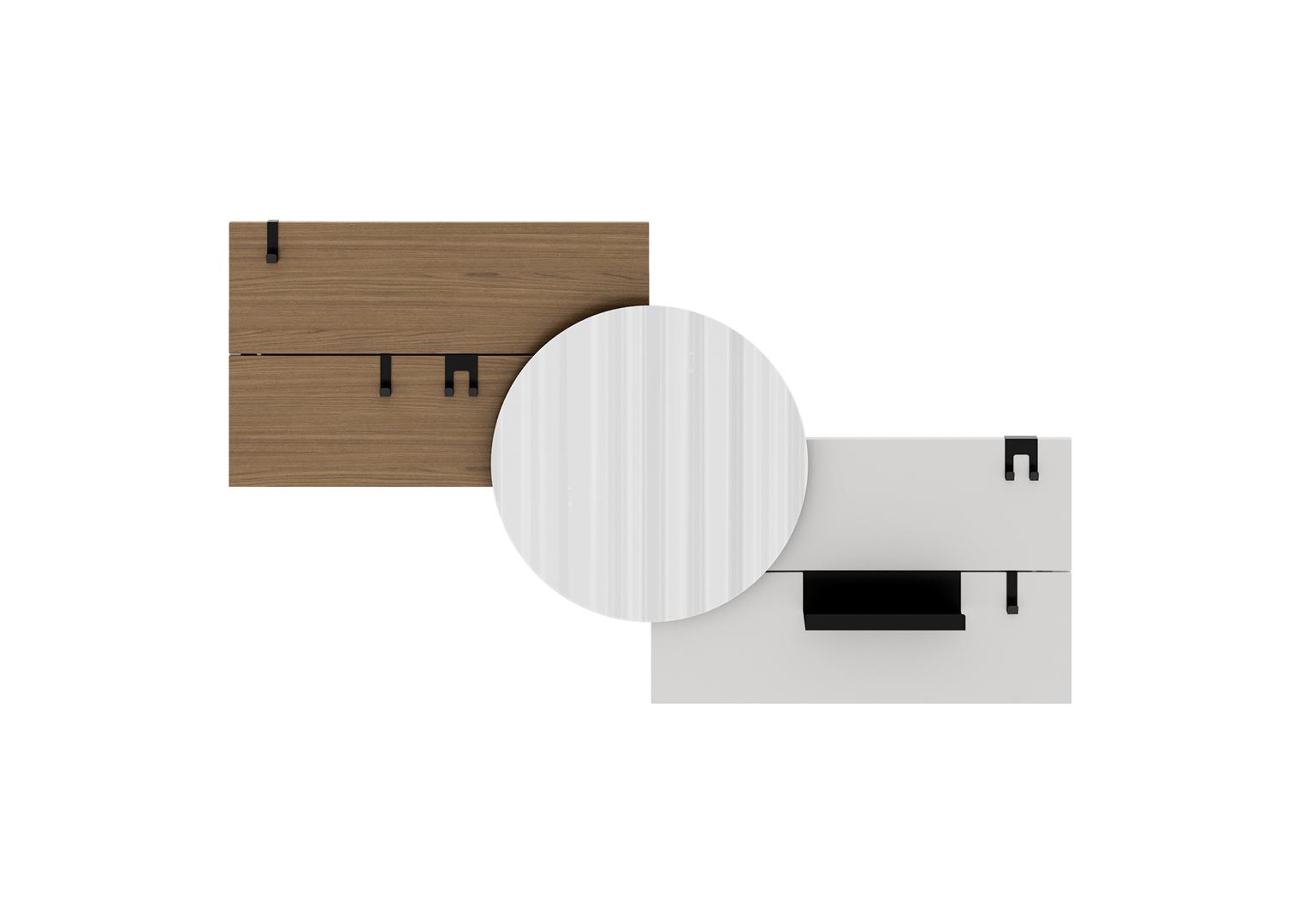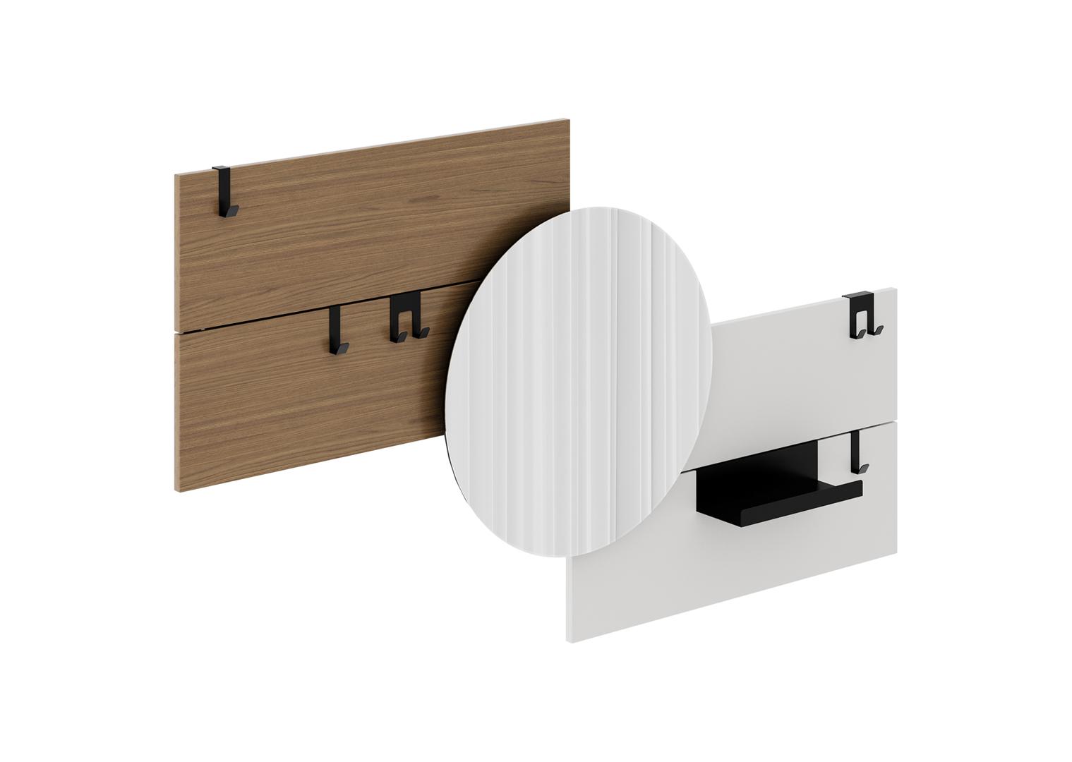 Вешалка Stripe M горизонтальная с зеркалом D 60 см Комплект: - панель 80*50,5 см 2 шт - зеркало D 60 см - крючок одинарный 3 шт - крючок двойной 2 шт - полка прямая 1 шт Покрытие панели шпон дуба, эмаль NCS S 1502-Y50R Покрытие крючков и полок порошковая краска цвет черный