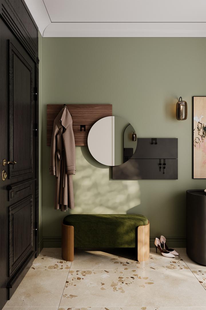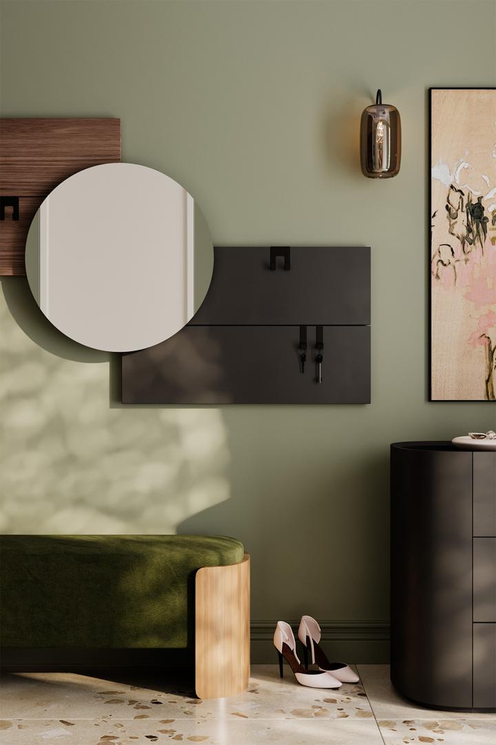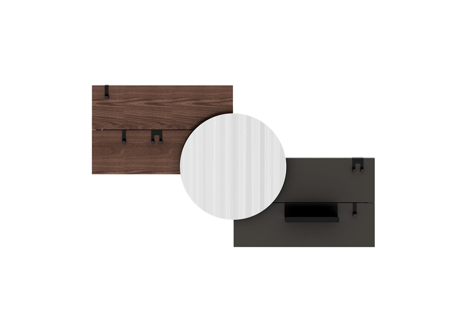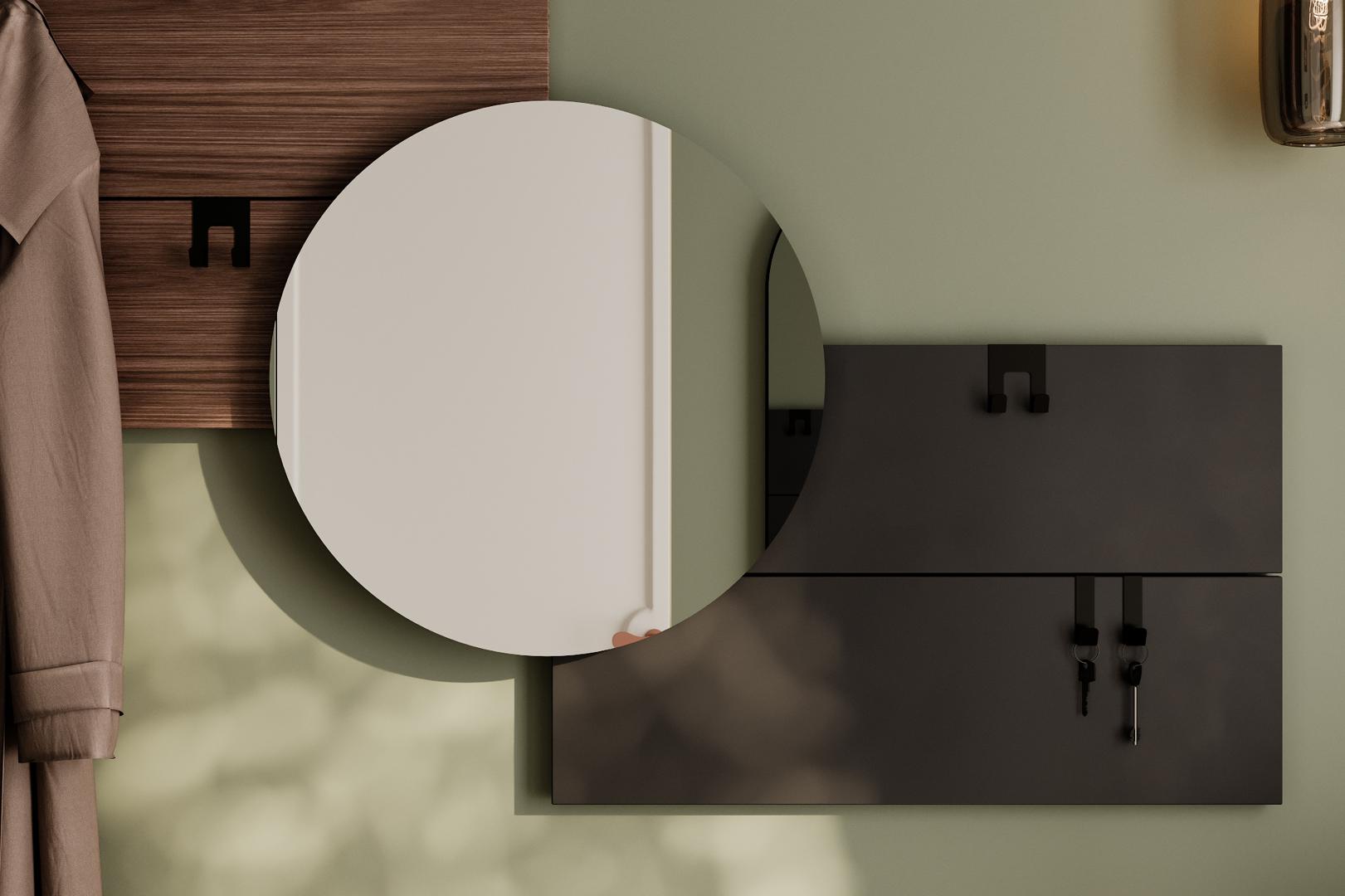 Вешалка Stripe M горизонтальная с зеркалом D 60 см Комплект: - панель 80*50,5 см 2 шт - зеркало D 60 см - крючок одинарный 3 шт - крючок двойной 2 шт - полка прямая 1 шт Покрытие панели шпон ореха, эмаль RAL 9005 Покрытие крючков и полок порошковая краска цвет черный