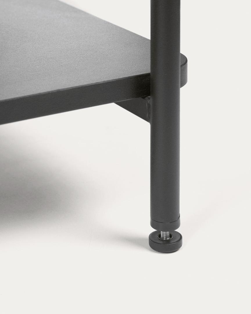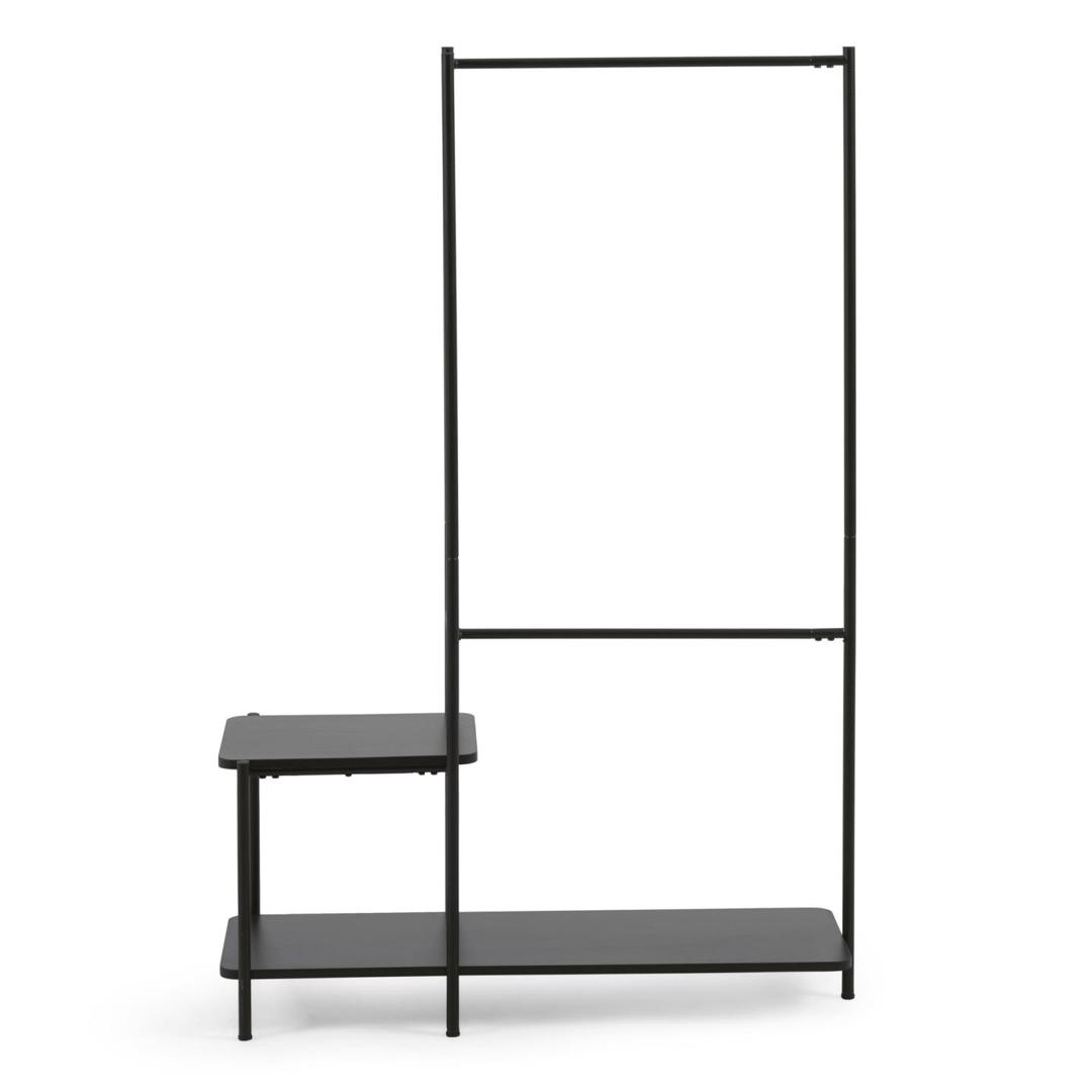 Вешалка для одежды для стен с черными меламиновыми полками. Металлическая конструкция с черной отделкой. Дизайн с минималистскими линиями в черном цвете. Идеально подходит для того, чтобы максимально использовать пространство и добавить стиль в ваш холл, гардеробную или спальню.