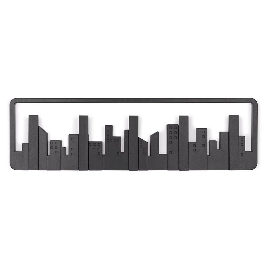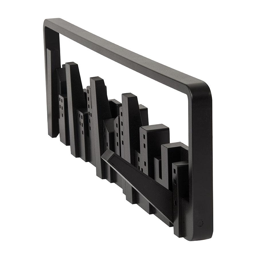 Настенная вешалка Skyline торговой марки Umbra сочетает в себе функциональность и простоту форм. Оригинальное исполнение изделия – это заслуга креативных дизайнеров Хелены Т. Миллер и Трейси Вонг. Вешалка представлена в виде городского пейзажа с многоэтажными домами. Для изготовления конструкции использовался экологически безопасный полистирол, который отличается высокой прочностью и износоустойчивостью. Вешалка имеет 5 откидных крючков, каждый из которых способен выдержать нагрузку до 2 кг. Материалы: ABS-пластик, сталь. Размеры: 3х14,5х50 см.
