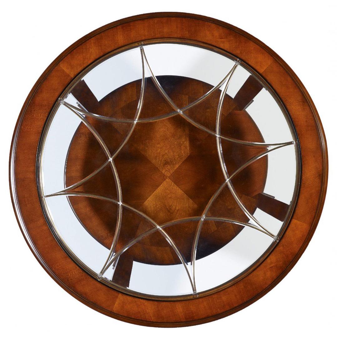 Коктейльный стол выполнен в традиционном стиле. Сам стол изготовлен из лиственных твердых пород дерева с использованием вишневого шпона, столешница же выполнена из стекла с латунными вставками. Медные вставки подняты выше стекла на один миллиметр. Прекрасный выбор для тех, кто ищет стильные решения для своего дома.