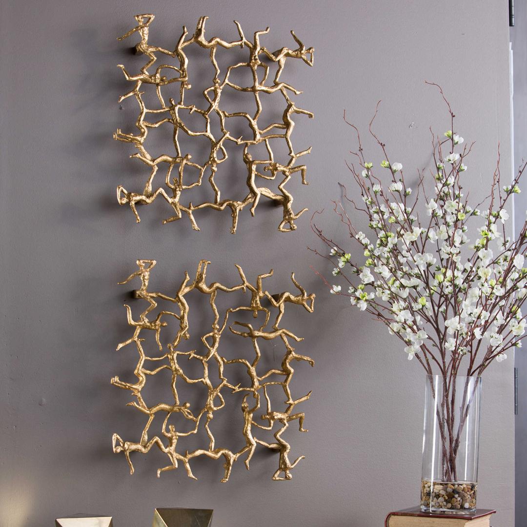 Весьма интересный вариант настенного декора, который придется по вкусу многим. Изготовлен декор из металла в золотой отделке и представляет из себя причудливую композицию из маленьких фигурок гимнастов. Такой декор сумеет не только вписаться практически в любой интерьер, но и привнесет в него нотки особого стиля и некую изюминку. Отлично подойдет в качестве подарка.