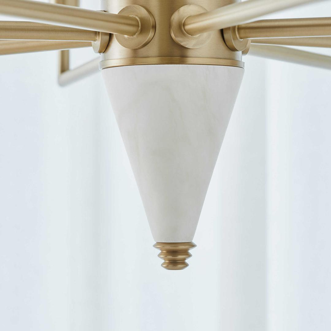 Чудесная люстра, выполненная в стиле ар-деко. Люстра представляет из себя стильное сочетание алебастрового основания, которое в силу аутентичности материала может быть местами более матовым, местами иметь более темные прожилки, и металлических деталей в латунной отделке. Завершает этот стильный образ аккуратные плафоны из шелковой ткани. Поставляется с 20-дюймовым проводом и 7-дюймовой цепью для регулируемой установки.