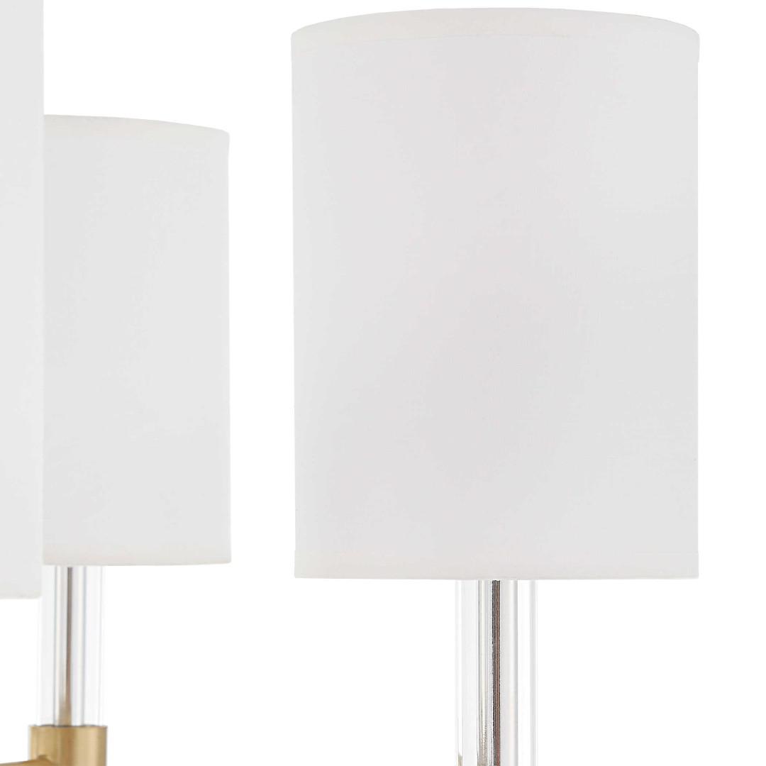 Чудесная люстра, выполненная в стиле ар-деко с отделкой из теплой латуни, модернизированная тонкой центральной колонной из прозрачного стекла с акцентами из прозрачного акрила и белыми шелковистыми плафонами. Завершает этот стильный образ аккуратные плафоны из шелковой ткани.