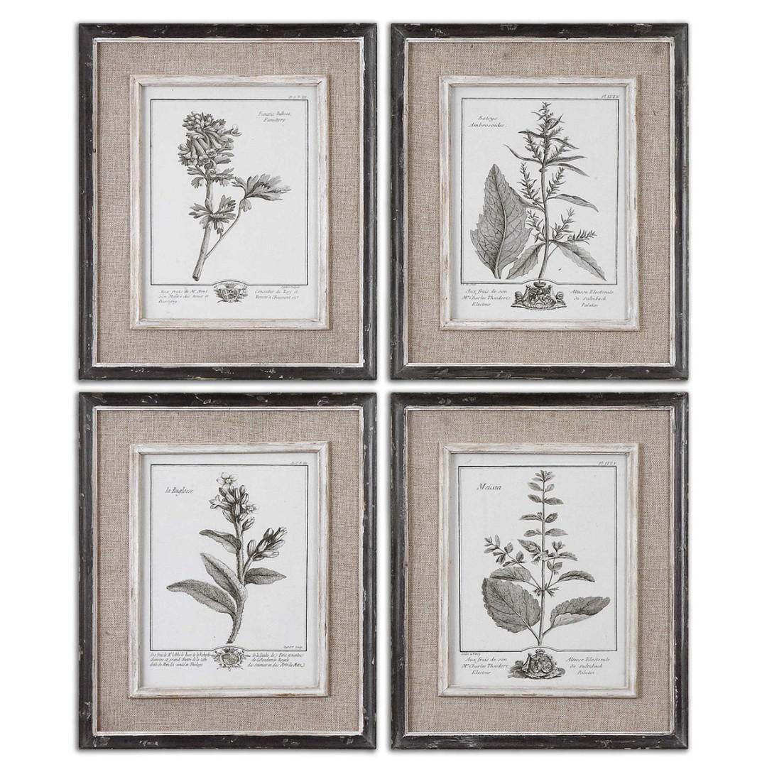 Эти ботанические принты оформлены в старинном стиле. Каждый черно-белый принт окружен светло-коричневым холстом из льна. Внешние рамки имеют черную отделку с серыми оттенками, внутренние покрыты белой краской. Рамки принтов выполнены из дерева. Каждый принт помещен под стекло. Стоимость дана за один постер.