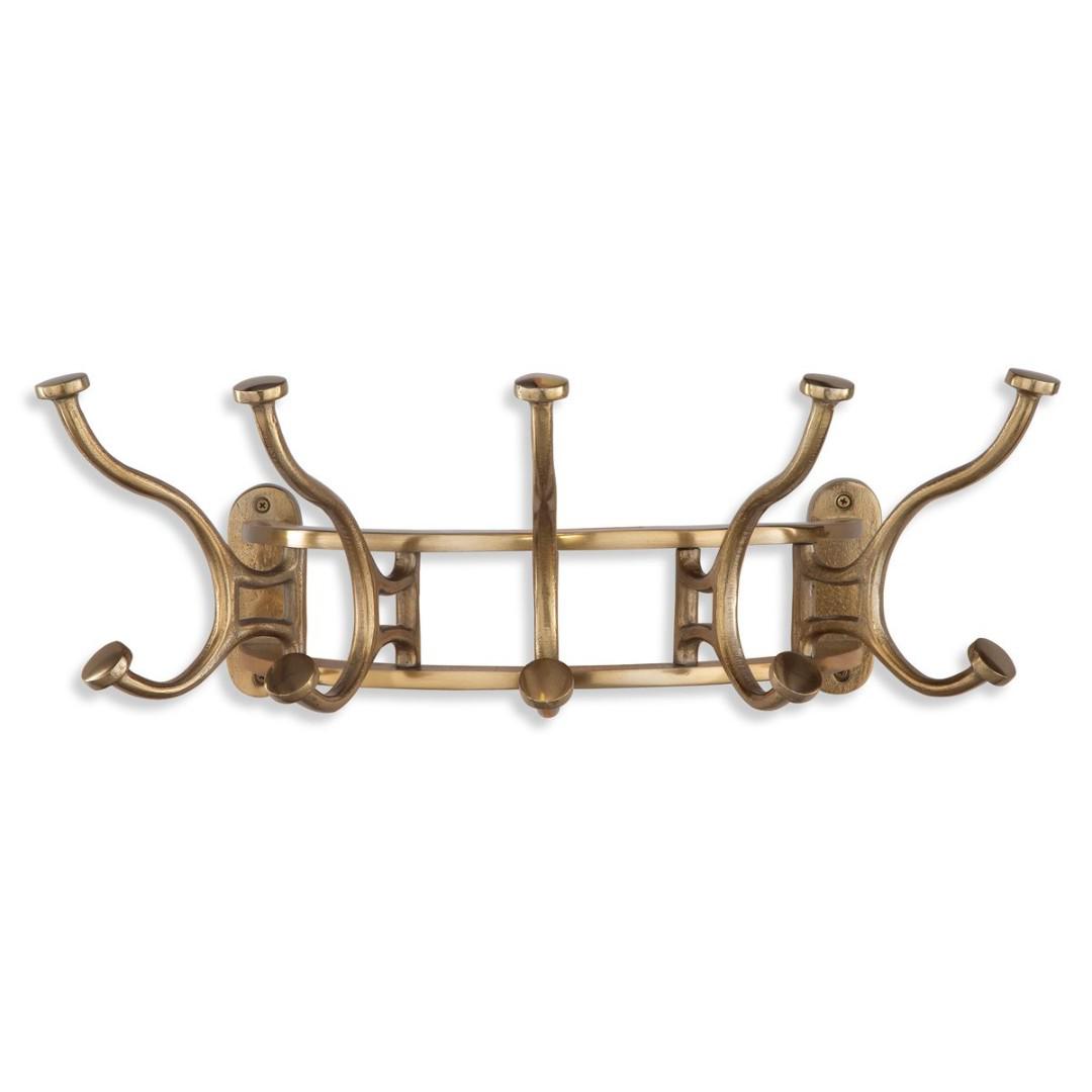 Причудливая настенная вешалка из литого алюминия с элегантно изогнутыми крючками, отделанными под старинную латунь. Крючки стационарные.