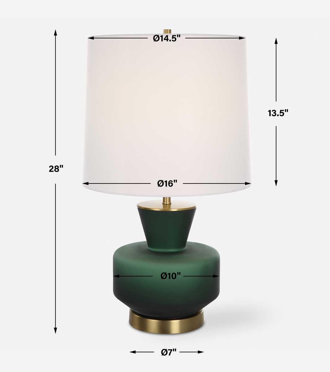 Эта настольная лампа, вдохновлённая стилем модерн середины века, имеет уникальное основание из тёмно-изумрудного стекла, дополненное слегка состаренными латунными деталями. Круглый конический абажур с твёрдой спинкой обтянут белоснежной льняной тканью.