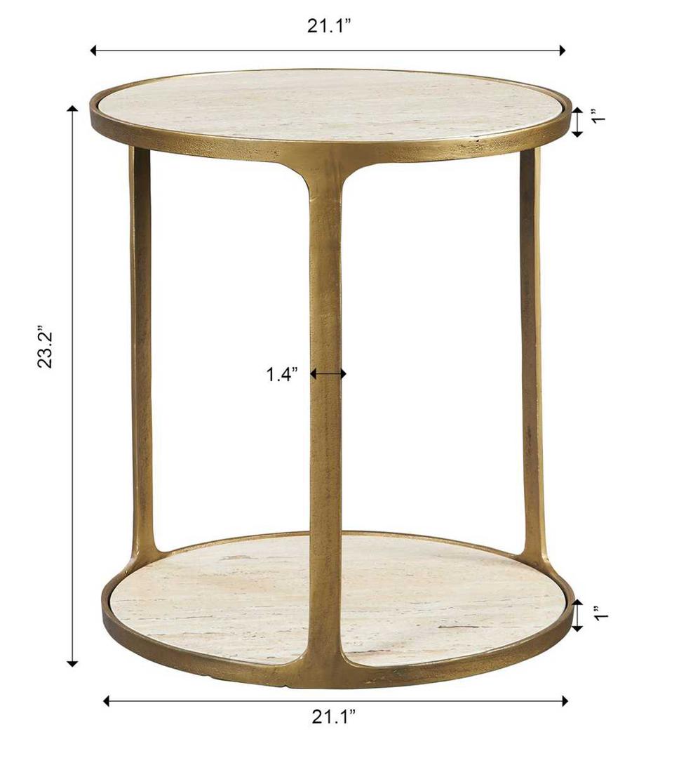 Приставной столик Clench в тёплых тонах станет идеальным акцентом в любом современном интерьере. Богатый каркас из литого алюминия под старинную латунь дополнен полками из бежевого травертина. Из-за особенностей натурального камня каждый предмет будет немного отличаться, что гарантирует уникальность вашего стола.