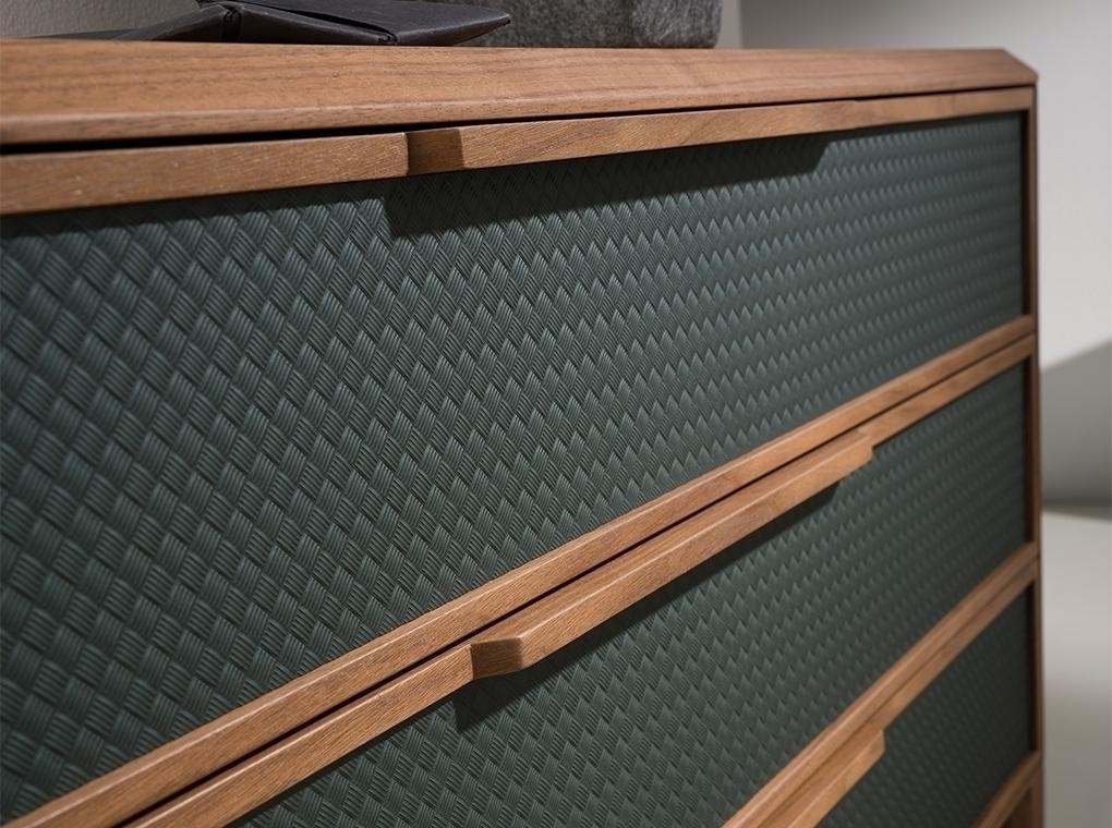 Комод современного дизайна с темно-зеленой структурой из ПВХ и оригинальными деревянными ножками из натурального шпона ореха. Он имеет большое пространство для хранения с 3 ящиками с системой открывания с язычковыми ручками и системой плавного закрывания.