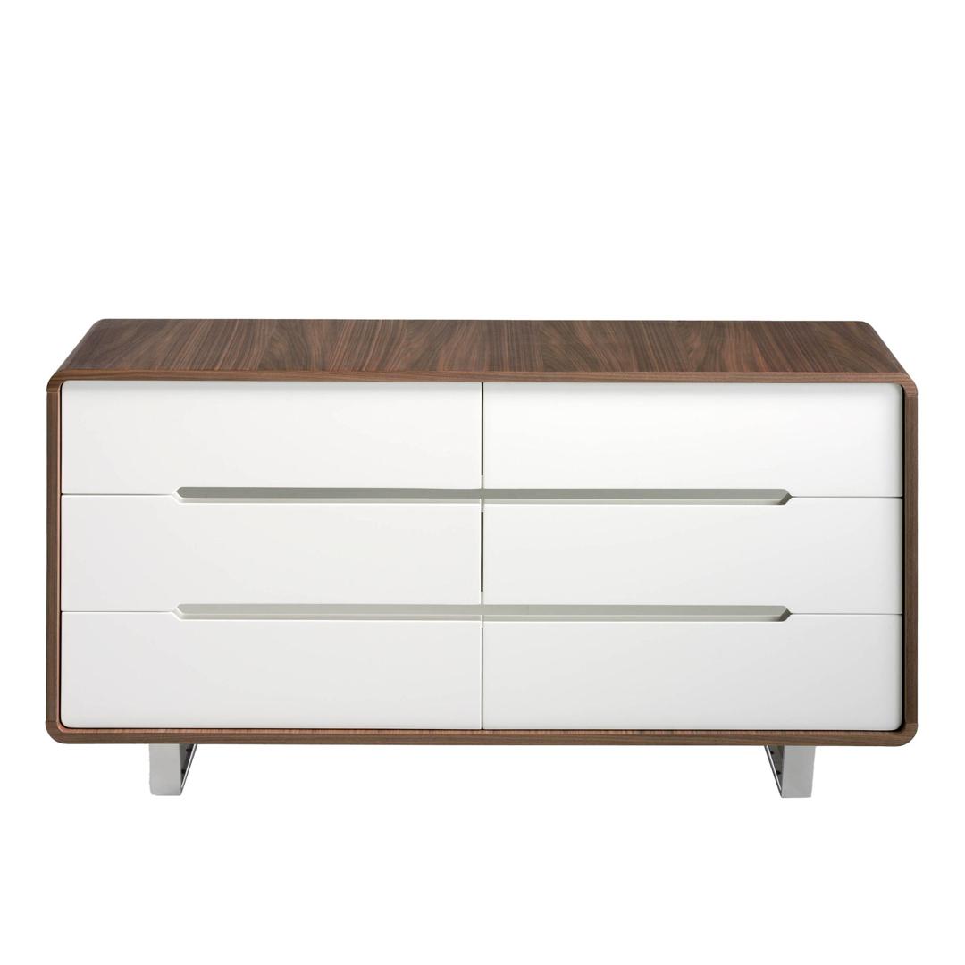 Комод из орехового дерева с белыми ящиками 136-C /7106 от фабрики Angel Cerda – ваш элегантный стиль в современном формате. Комод из коллекции Taos подарит вашей обстановке гармонию и красоту. Его идеальное исполнение объединяет в себе завершенный внешний вид, эргономику и демонстрацию уникальной фактуры дерева. Два цвета прекрасно дополняют друг друга, делают изделие более ярким на вид и универсальным для любого европейского дизайна. А вместительные ящики скроют от посторонних глаз самые домашние вещи. Комод выполнен из высококачественного МДФ и натурального орехового шпона толщиной 0,5 мм. Внутреннее наполнение – шесть одинаковых по своему размеру ящиков, оснащенных мягкой системой открытия и прочными металлическими направляющими. Фасады ящиков покрыты лаком RAL9003 Glossy White. Ножки сделаны из хромированной стали и практически скрыты от глаз. Они обеспечивают надежное распределение нагрузки и не деформируют напольное покрытие. Максимальная суммарная нагрузка на комод не должна превышать 40 кг. Каждый ящик рассчитан на предельный вес в 5 кг. Комод не рекомендуется использовать в помещениях с высокой влажностью. Для чистки следует использовать мягкую ткань. Вес изделия – 8,2 кг. Поставка осуществляется в собранном виде. Отделка ящиков - лак Blanco Similar 9003 - Brillo.