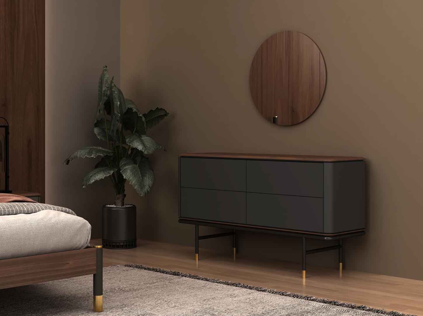 Современный дизайн комода с темно-серой деревянной конструкцией из МДФ с матовой отделкой и оригинальными черными ножками из нержавеющей стали. Благодаря элегантной деревянной столешнице из натурального орехового шпона вы получите изысканный вид, который ищете в своих комнатах. Его оригинальные золотистые полированные детали из нержавеющей стали добавят идеальный штрих стиля в вашу гостиную. Он имеет достаточно места для хранения с 4 ящиками с системой открывания и закрывания push and pull.